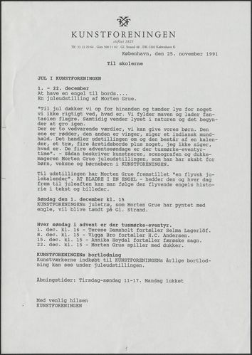 Tilbage Kunstforeningen Skoletjeneste, 1991: At have en engel til bords. En juleudstilling af Morten Grue Fakta Dokumenttype Udstillingsprotokol Omtalte personer Morten Grue Omtalte udstillinger 1991-12-1 - 1991-12-22, At have en engel til bords. En juleudstilling af Morten Grue Original