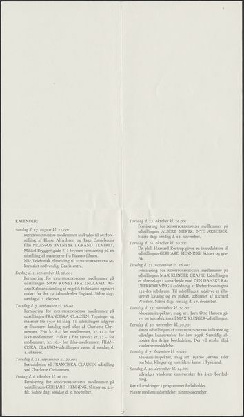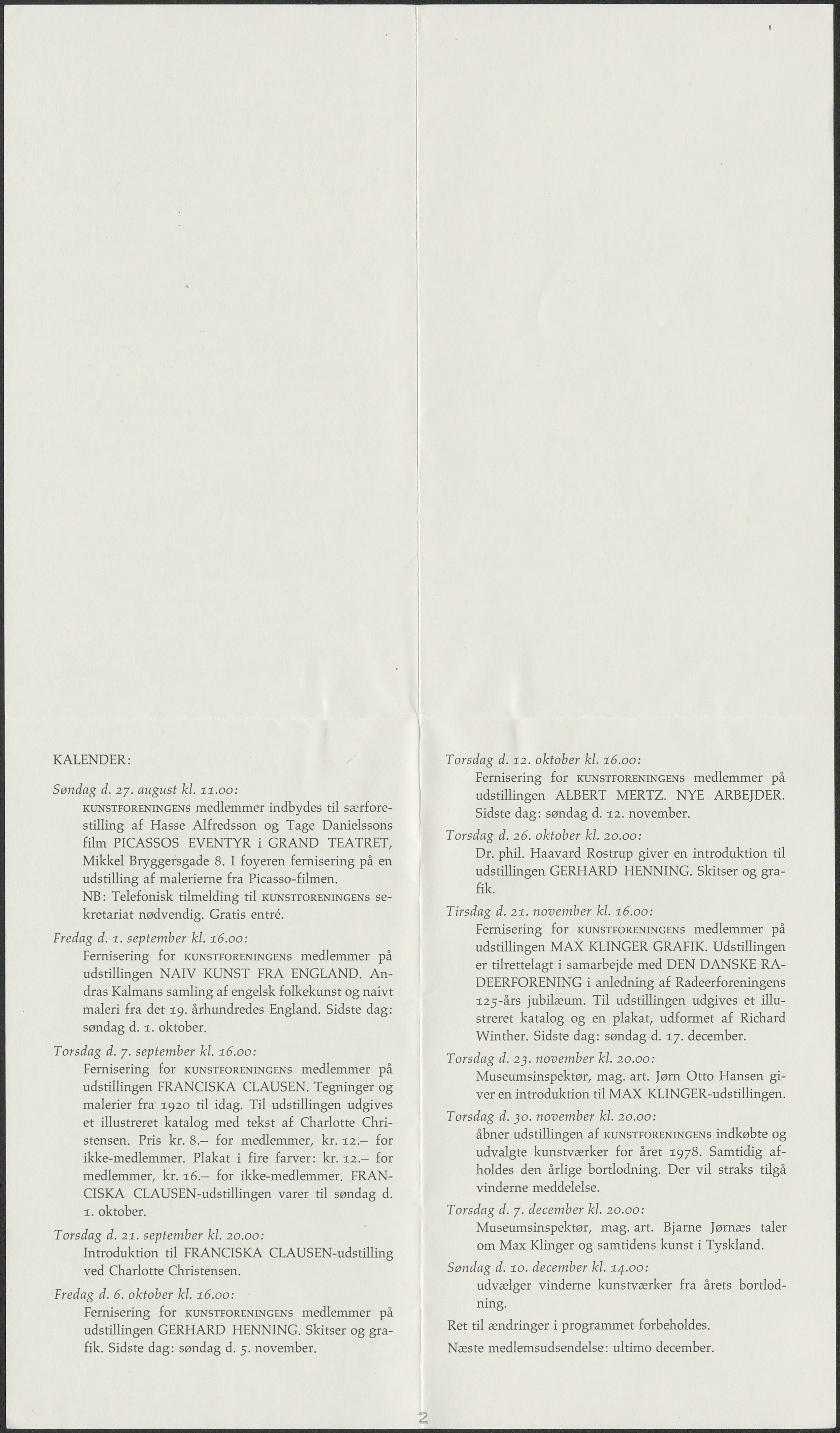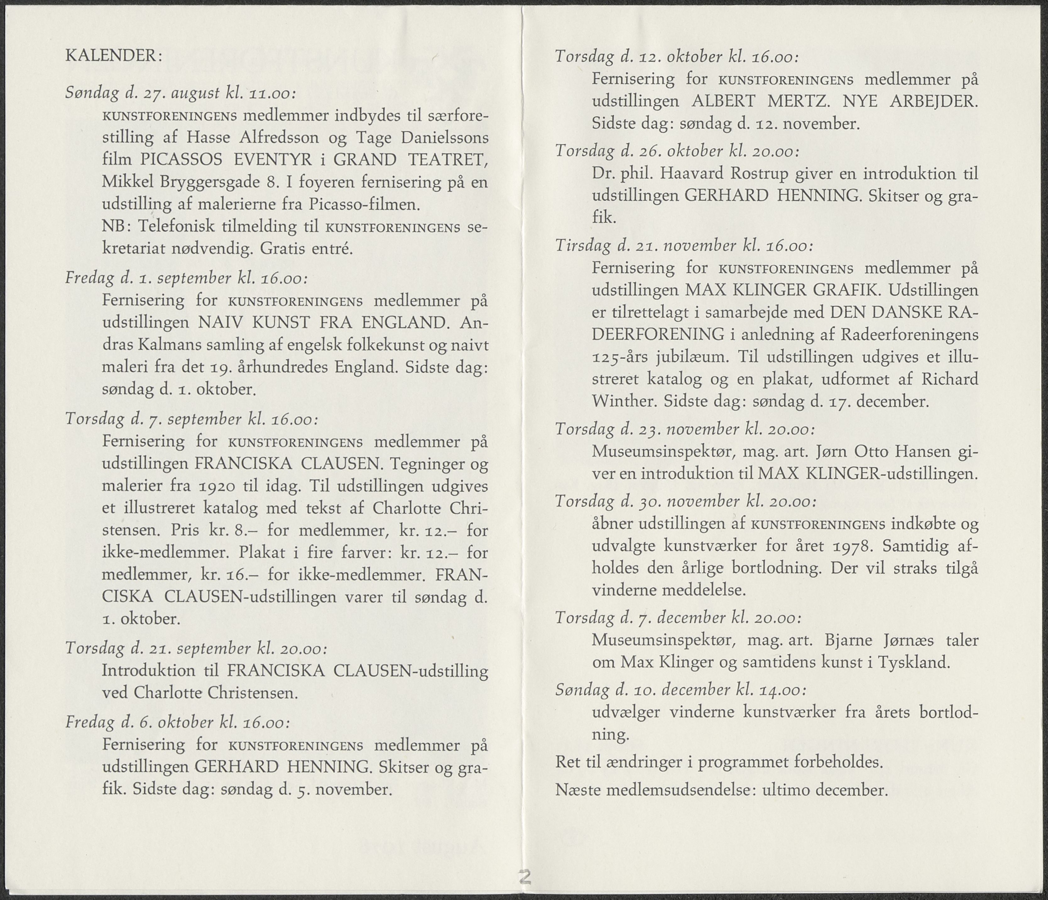 Tilbage Kunstforeningen 1978 Dokumentindhold Medlemsfolder til Kunstforeningens udstilling med Max Klinger i 1978. Fakta Dokumenttype Brochure Omtalte personer Max Klinger Omtalte udstillinger 1978-11-22 - 1978-12-17, Max Klinger. Grafiske arbejder Original