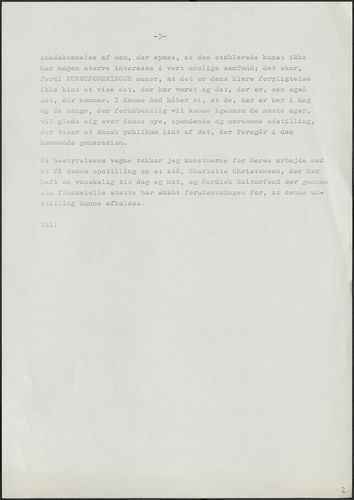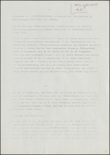 Tilbage Kunstforeningen 1978-03-31 Dokumentindhold Ikke afholdt tale ifm. åbningen af Kunstforeningens udstilling "Fire unge fra Norden" i 1978. Fakta Dokumenttype Tale Omtalte personer Viggo AndersenOlafur LarussonBjørn NørgaardAnders Åberg Omtalte udstillinger 1978-3-31 - 1978-4-30, Fire unge fra Norden Original