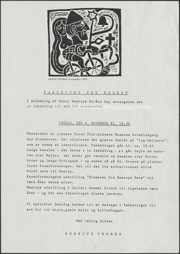 Tilbage Kunstforeningen 1987-11-06 Dokumentindhold Invitation til fakkeltog i anledning af billedkunstner Henry Heerups (1907-1993) 80 års fødselsdag. Fakta Dokumenttype Invitationskort Omtalte personer Henry Heerup Omtalte udstillinger 1987-11-7 - 1987-12-6, Blomster fra Heerups have Original
