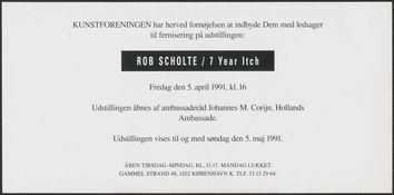Tilbage Kunstforeningen 1991-04-05 Dokumentindhold Ferniseringsinvitation, 1991: Rob Scholte. 7 Year Itch Fakta Dokumenttype Invitationskort Afsendersted København Omtalte personer Rob Scholte Omtalte udstillinger 1991-4-6 - 1991-5-5, Rob Scholte. 7 Year Itch Original
