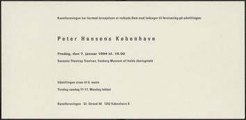 Tilbage Kunstforeningen 1994-01-07 Dokumentindhold Ferniseringsinvitation, 1994: Peter Hansens København Fakta Dokumenttype Invitationskort Afsendersted København Omtalte personer Peter Hansen Omtalte udstillinger 1994-1-6 - 1994-3-6, Peter Hansens København Original