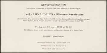 Tilbage Kunstforeningen 1994-03-18 Dokumentindhold Ferniseringinvitation, 1994: [cut] - LOS ANGELES - 90'ernes kunstscene Fakta Dokumenttype Invitationskort Afsendersted København Omtalte personer Chris BurdenMeg CranstonMike KelleyPaul McCarthyRaymond PettibonJean RasenbergerNancy RubinsSarah SeagerThaddeus StrodeBenjamin WeissmanChris Wilder Omtalte udstillinger 1994-3-19 - 1994-5-1, [cut] - LOS ANGELES - 90'ernes kunstscene Original