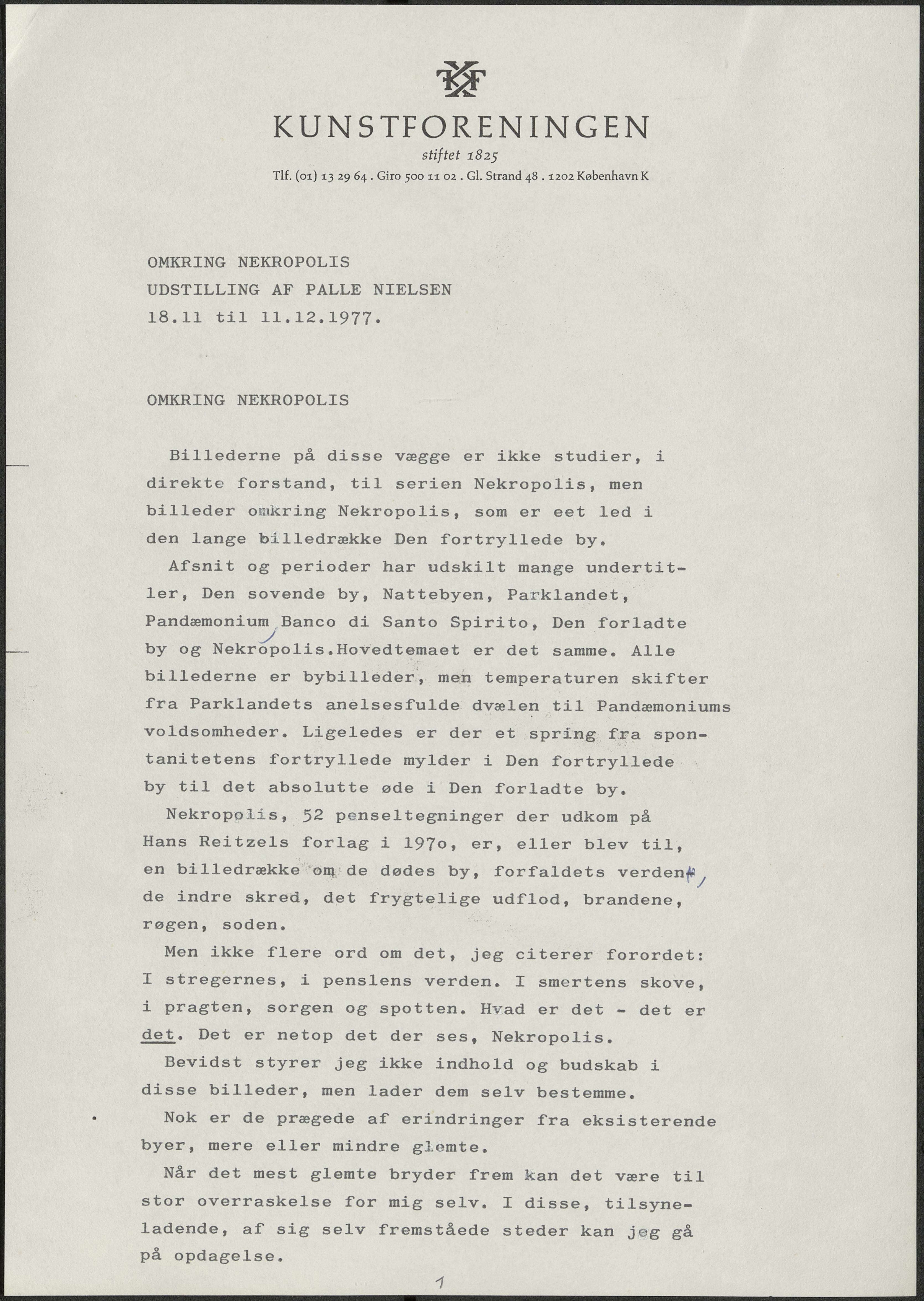 Back Kunstforeningen Formidlingsmateriale, 1977: Omkring Nekropolis - udstilling af Palle Nielsen Facts Document type Exhibition records Mentioned people Palle Nielsen Mentioned exhibitions 1977-11-18 - 1977-12-11, Omkring Nekropolis - udstilling af Palle Nielsen Original