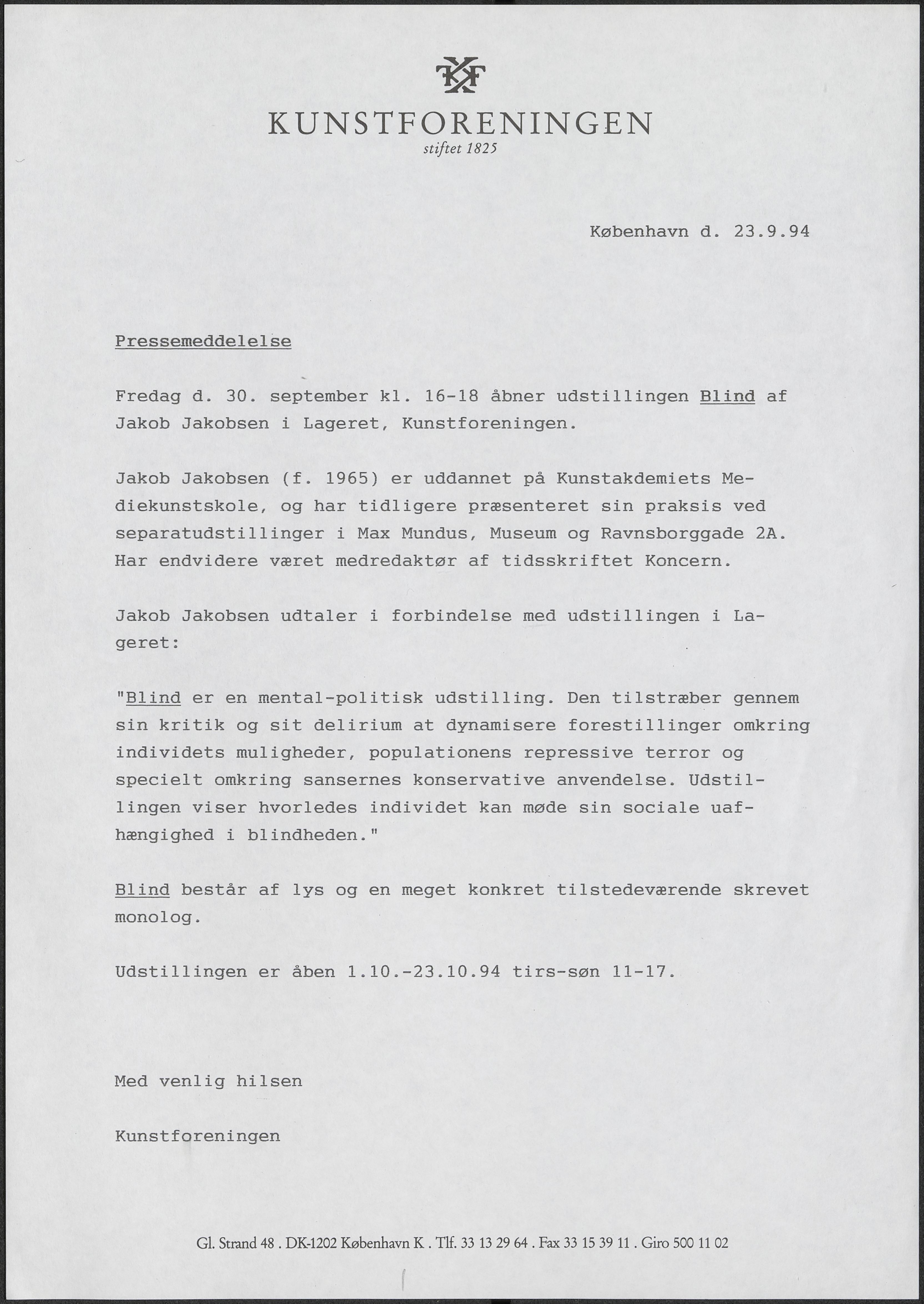 Back Kunstforeningen Pressemeddelelse, 1994: Jakob Jakobsen. Blind Facts Document type Exhibition records Mentioned people Jakob Jakobsen Mentioned exhibitions 1994-10-1 - 1994-10-23, Jakob Jakobsen. Blind Original