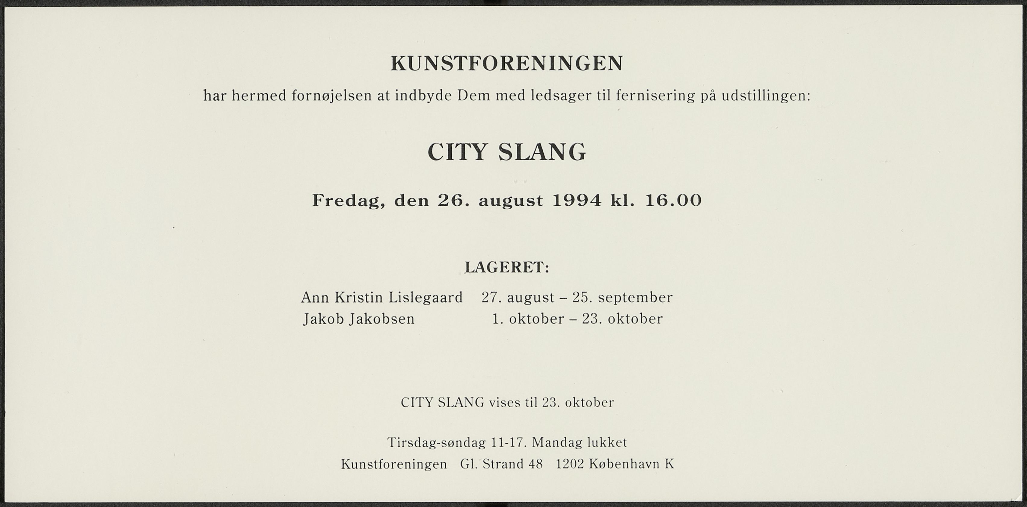 Back Kunstforeningen 1994-08-28 Document content Awaiting summary Facts Document type Invitation card Sender's location København Mentioned exhibitions 1994-8-27 - 1994-10-23, CITY SLANG Original