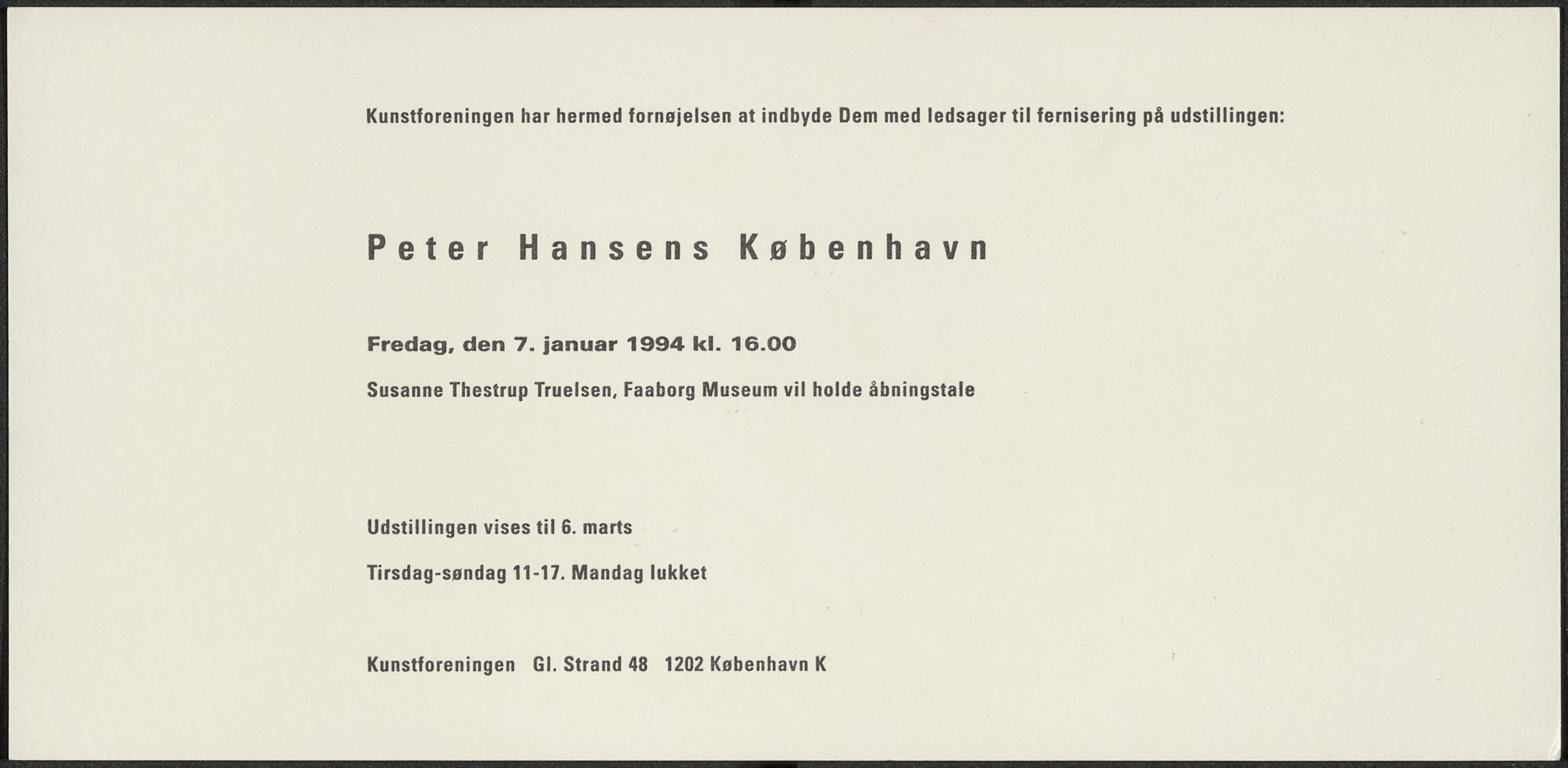 Back Kunstforeningen 1994-01-07 Document content Awaiting summary Facts Document type Invitation card Sender's location København Mentioned people Peter Hansen Mentioned exhibitions 1994-1-6 - 1994-3-6, Peter Hansens København Original