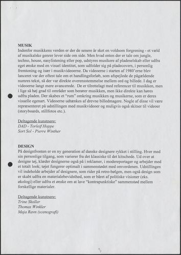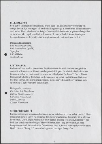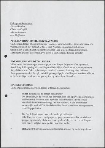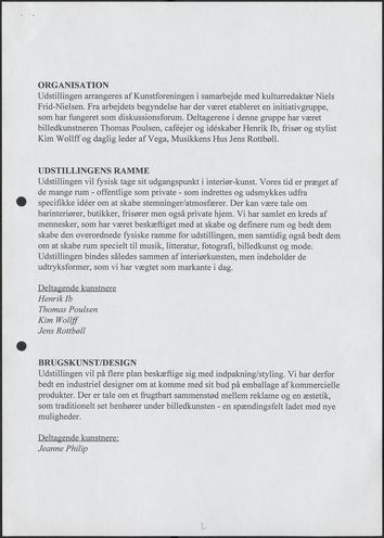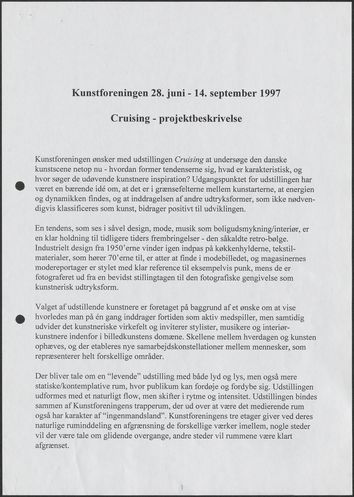 Back Kunstforeningen Projektbeskrivelse, 1997: Cruising Facts Document type Exhibition records Mentioned exhibitions 1997-6-28 - 1997-9-14, Cruising Original