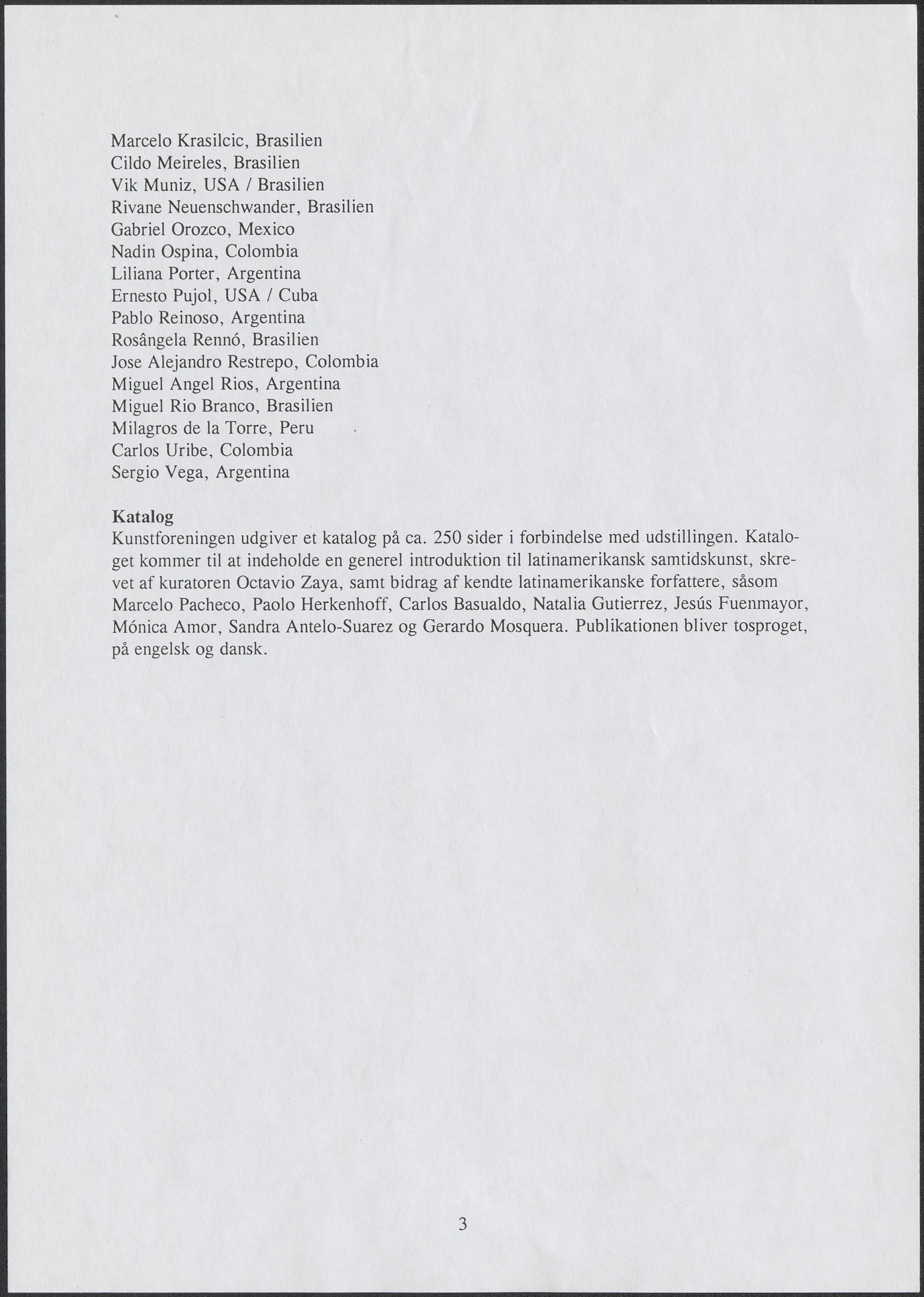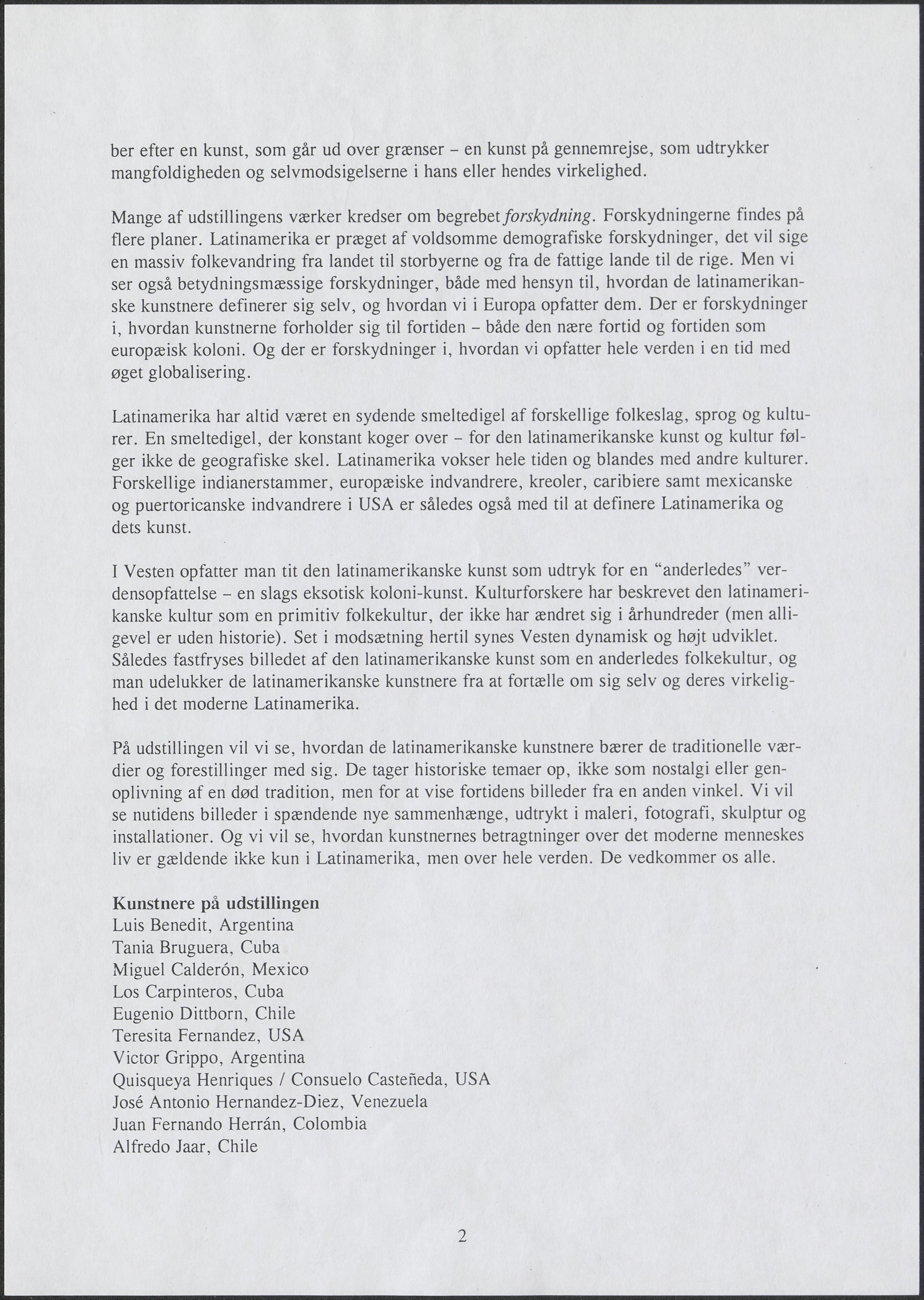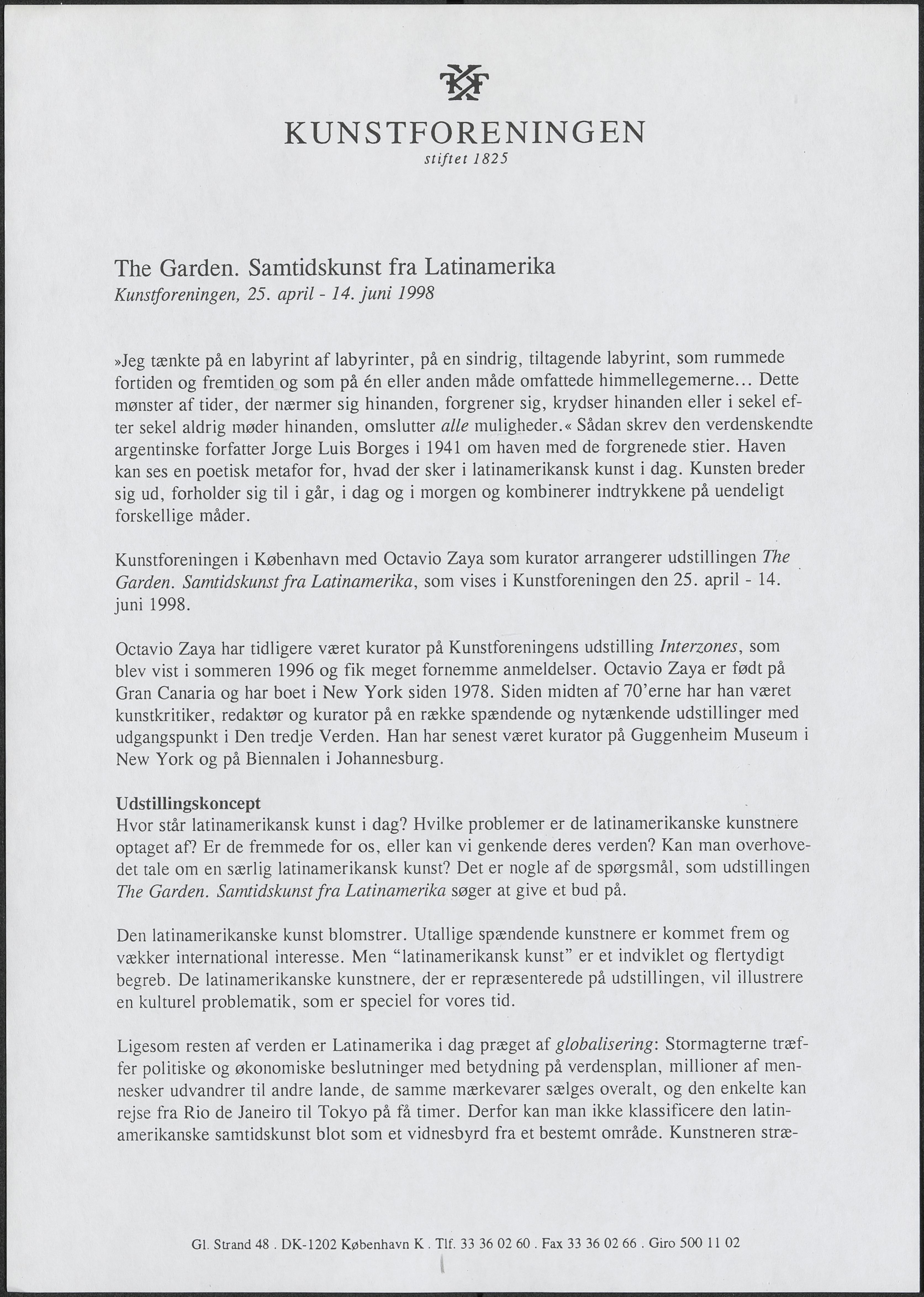 Back Kunstforeningen Projektbeskrivelse, 1998: The Garden of Forking Paths. 24 kunstnere fra Latinamerika Facts Document type Exhibition records Mentioned exhibitions 1998-4-25 - 1998-6-14, The Garden of Forking Paths. 24 kunstnere fra Latinamerika Original