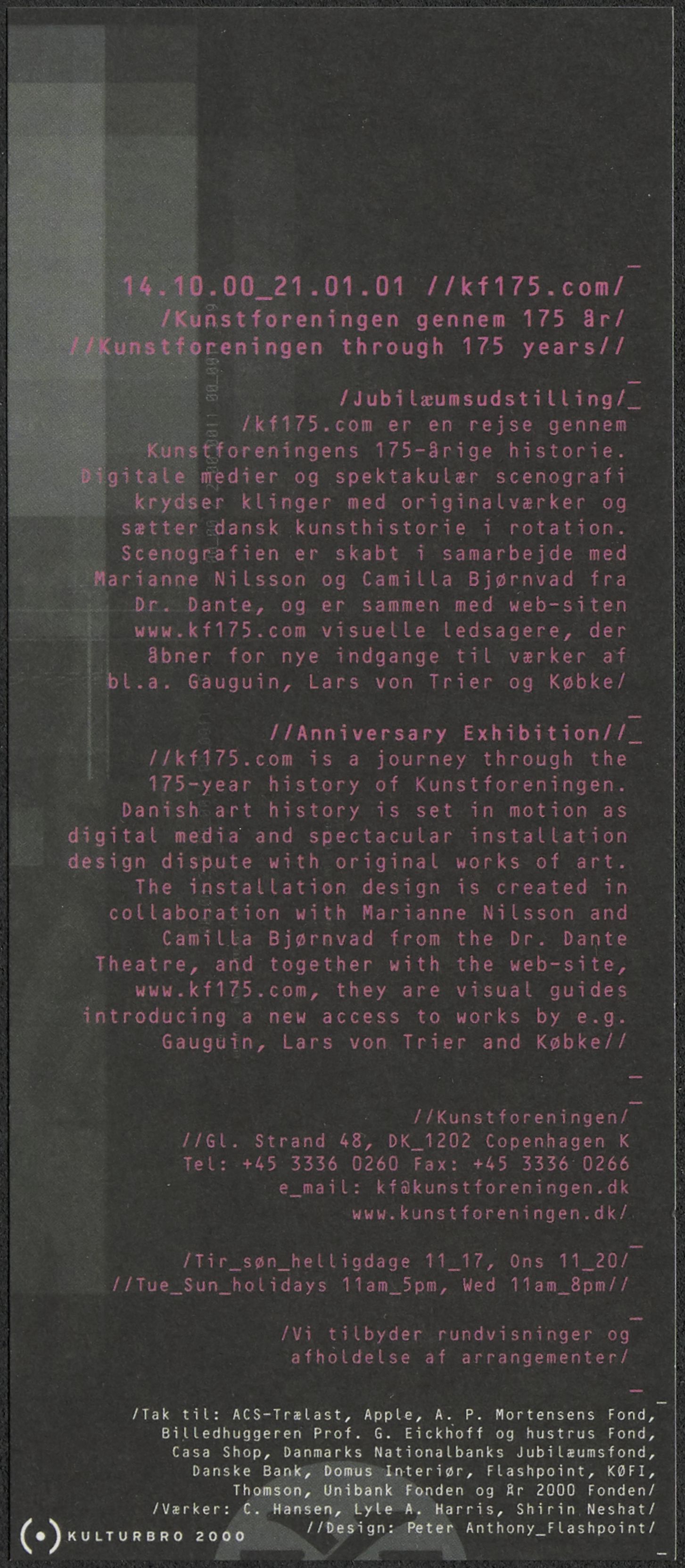 Back Kunstforeningen 2000 Facts Document type Brochure Mentioned exhibitions 2000-10-14 - 2001-1-1, kf175.com Original