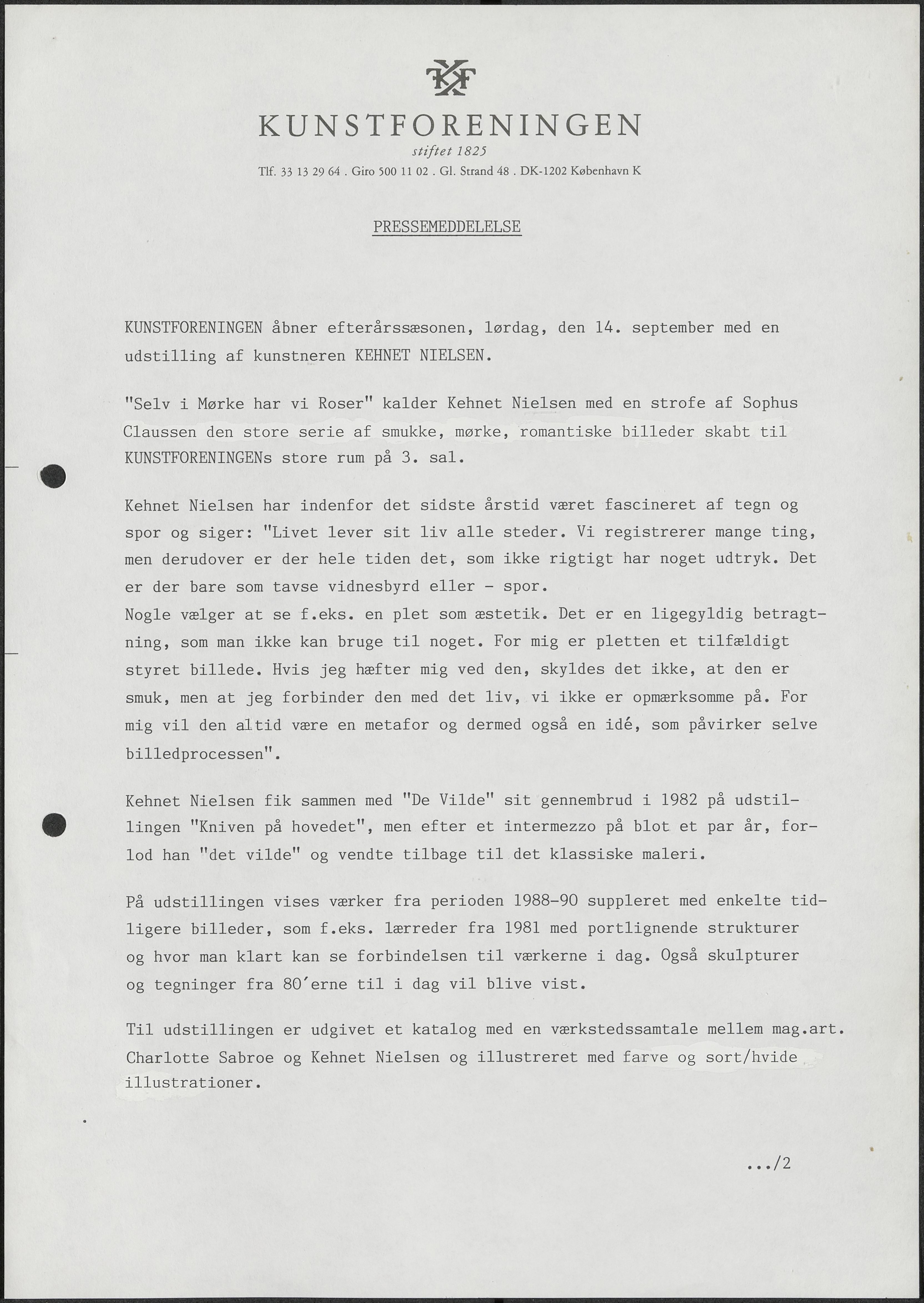 Back Kunstforeningen Pressemeddelelse, 1990: Kehnet Nielsen Facts Document type Exhibition records Mentioned people Kehnet Nielsen Mentioned exhibitions 1990-9-15 - 1990-10-21, Kehnet Nielsen Original