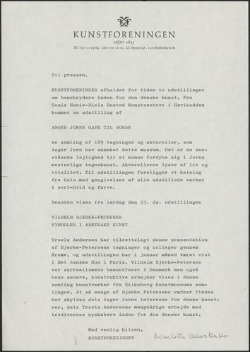 Back Kunstforeningen Pressemeddelelse, 1980: Asger Jorns gave til Norge Facts Document type Exhibition records Mentioned people Vilhelm Bjerke-PetersenAsger Jorn Mentioned exhibitions 1980-?-? - 1980-?-?, Vilhelm Bjerke-Petersen. Symboler i abstrakt kunst 1980-?-? - 1980-?-?, Asger Jorns gave til Norge Original