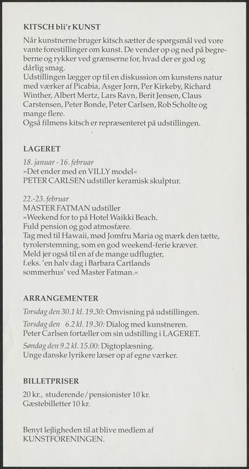 Back Kunstforeningen 1992 Facts Document type Brochure Mentioned people Peter BondePeter CarlsenClaus CarstensenBerit JensenAsger JornPer KirkebyMorten LindbergAlbert MertzFrancis PicabiaLars RavnRob ScholteRichard Winther Mentioned exhibitions 1992-1-18 - 1992-3-1, Kitsch bli'r kunst 1992-1-18 - 1992-2-16, Peter Carlsen. Det ender med en VILLY model 1992-2-21 - 1992-2-23, Master Fatman Original