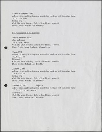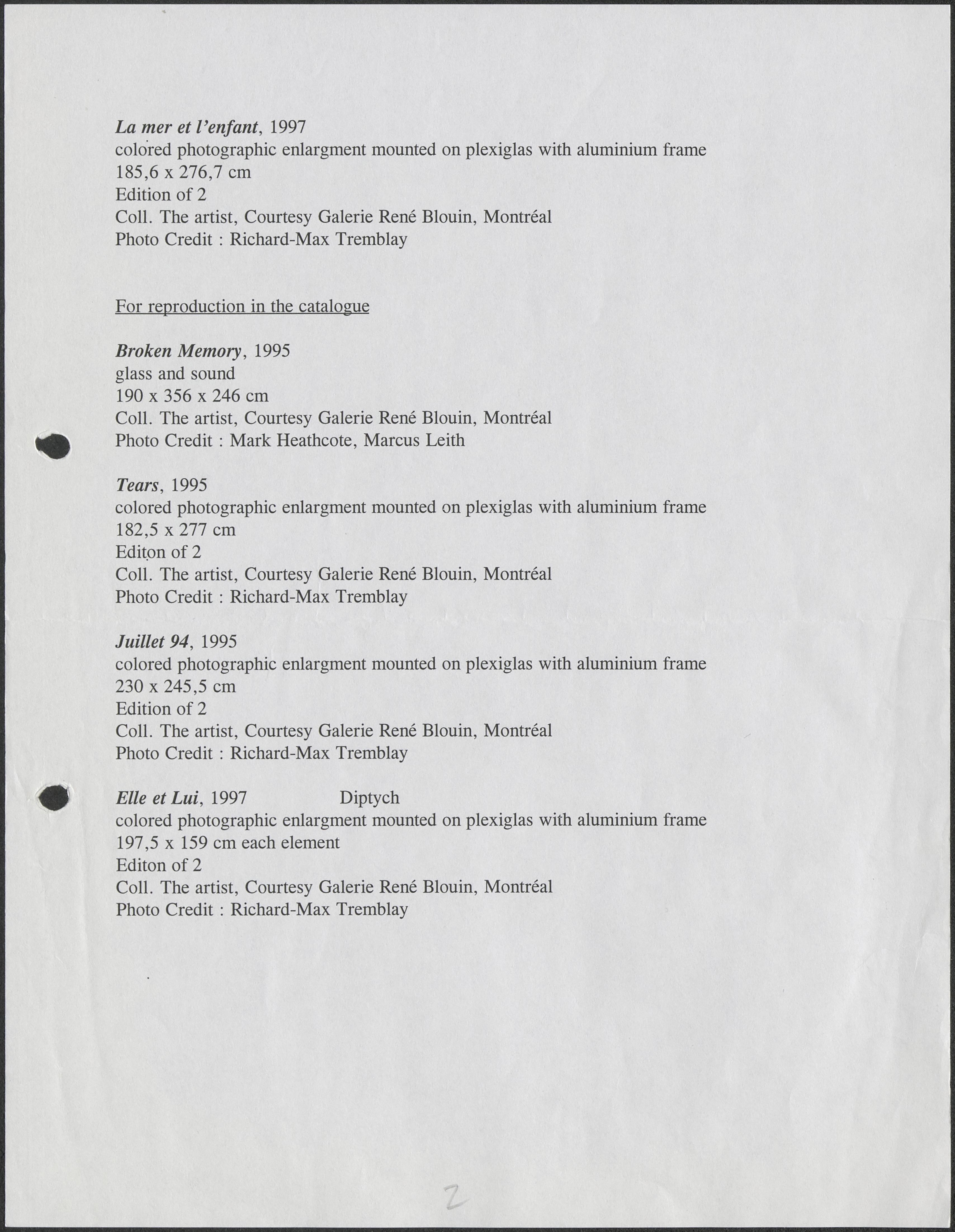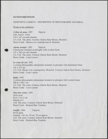 Back Kunstforeningen Værkliste, 1997: Geneviève Cadieux Facts Document type Exhibition records Mentioned people Geneviève Cadieux Mentioned exhibitions 1997-11-29 - 1998-1-11, Geneviève Cadieux, LeBouthiller, Cathrine Heard/Peter Neuchs Original