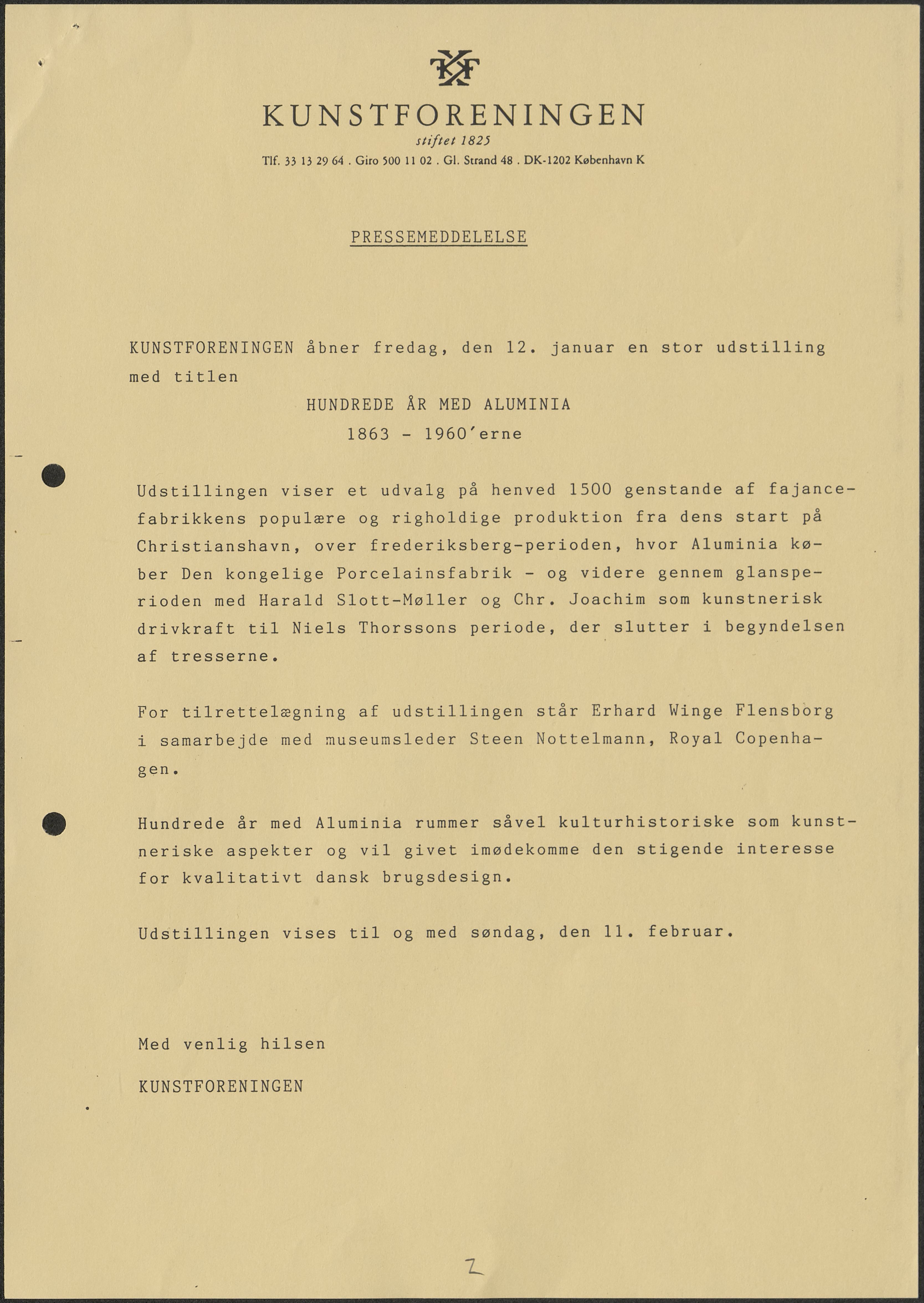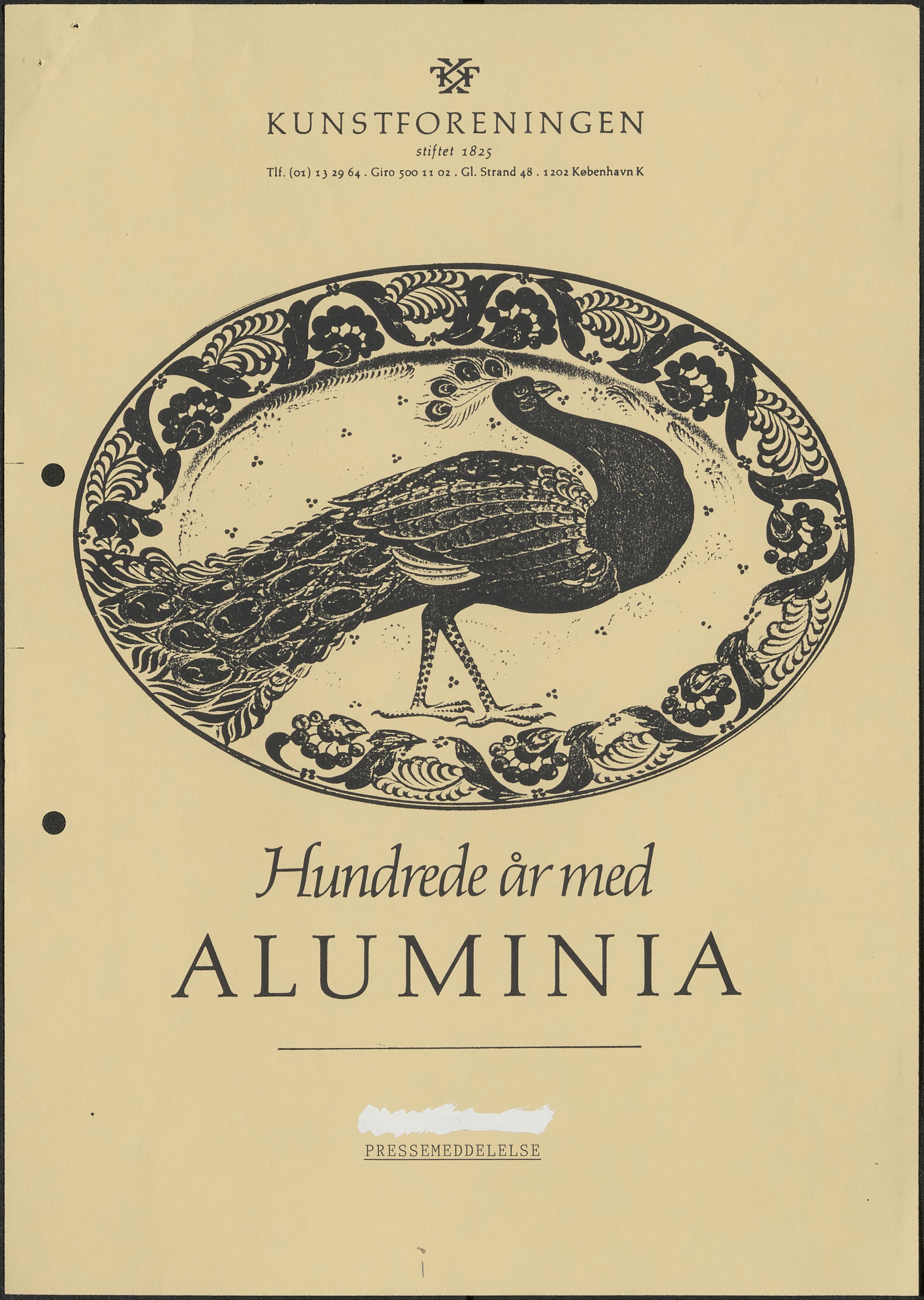 Back Kunstforeningen Pressemeddelelse, 1990: Hundrede år med Aluminia Facts Document type Exhibition records Mentioned exhibitions 1990-1-11 - 1990-2-11, Hundrede år med Aluminia Original