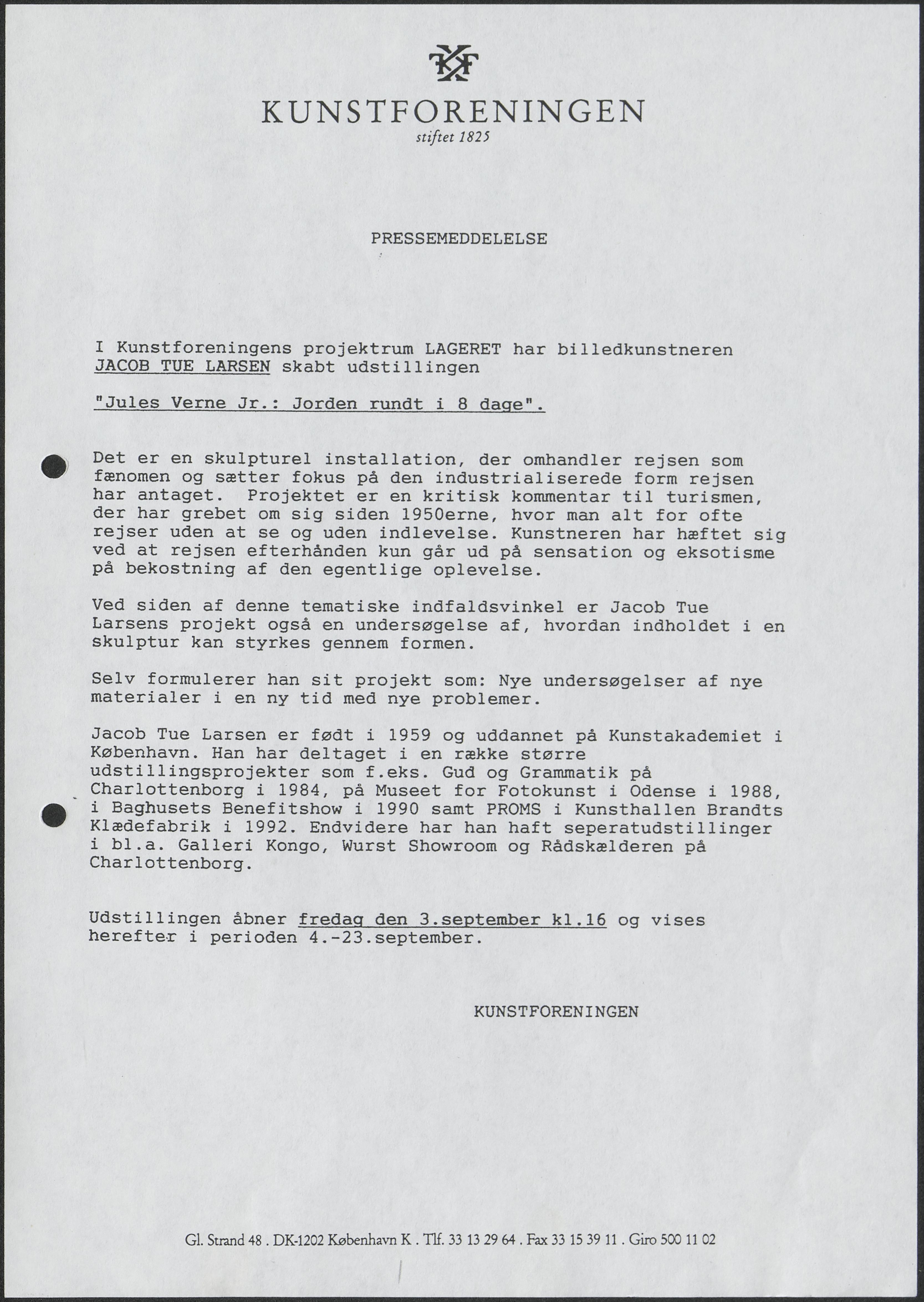 Back Kunstforeningen Pressemeddelelse, 1993: Jules Verne Jr.: Jorden rundt i 8 dage Facts Document type Exhibition records Mentioned people Jacob Tue Larsen Mentioned exhibitions 1993-9-4 - 1993-9-23, Jacob Tue Larsen. Jules Verne Jr.: Jorden rundt i 8 dage Original