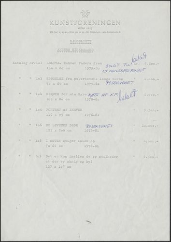 Back Kunstforeningen Salgsliste, 1981: Anders Kirkegaard Facts Document type Exhibition records Mentioned people Anders Kirkegaard Mentioned exhibitions 1981-2-14 - 1981-3-15, Anders Kirkegaard Original