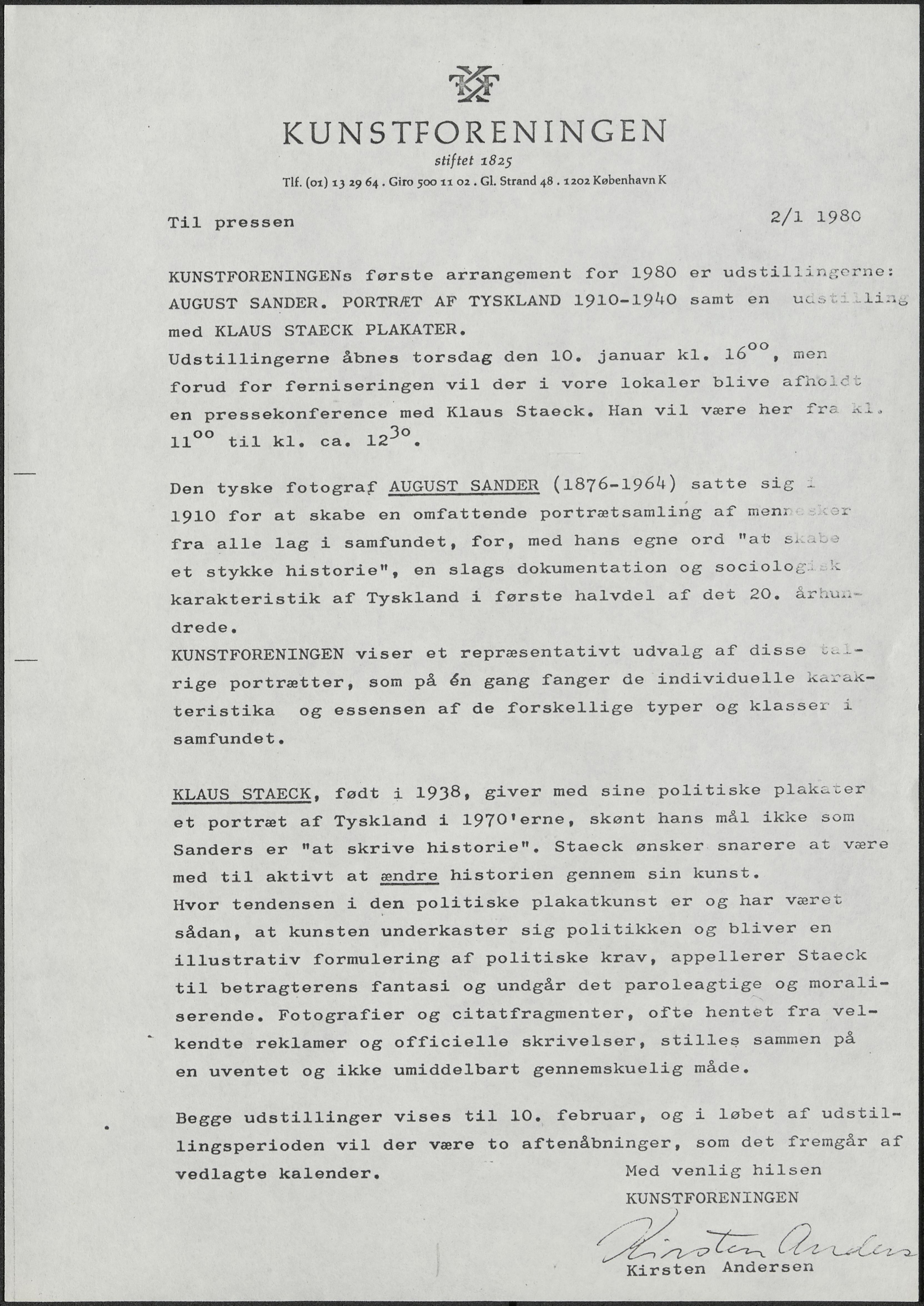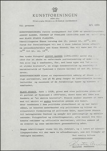 Back Kunstforeningen Pressemeddelelse, 1980: August Sander. Portræt af Tyskland 1910-1940 og Klaus Staek Plakater og Facts Document type Exhibition records Mentioned people August SanderKlaus Staek Mentioned exhibitions 1980-1-10 - 1980-2-10, August Sander. Portræt af Tyskland 1910-1940 1980-1-10 - 1980-2-10, Klaus Staek plakater Original