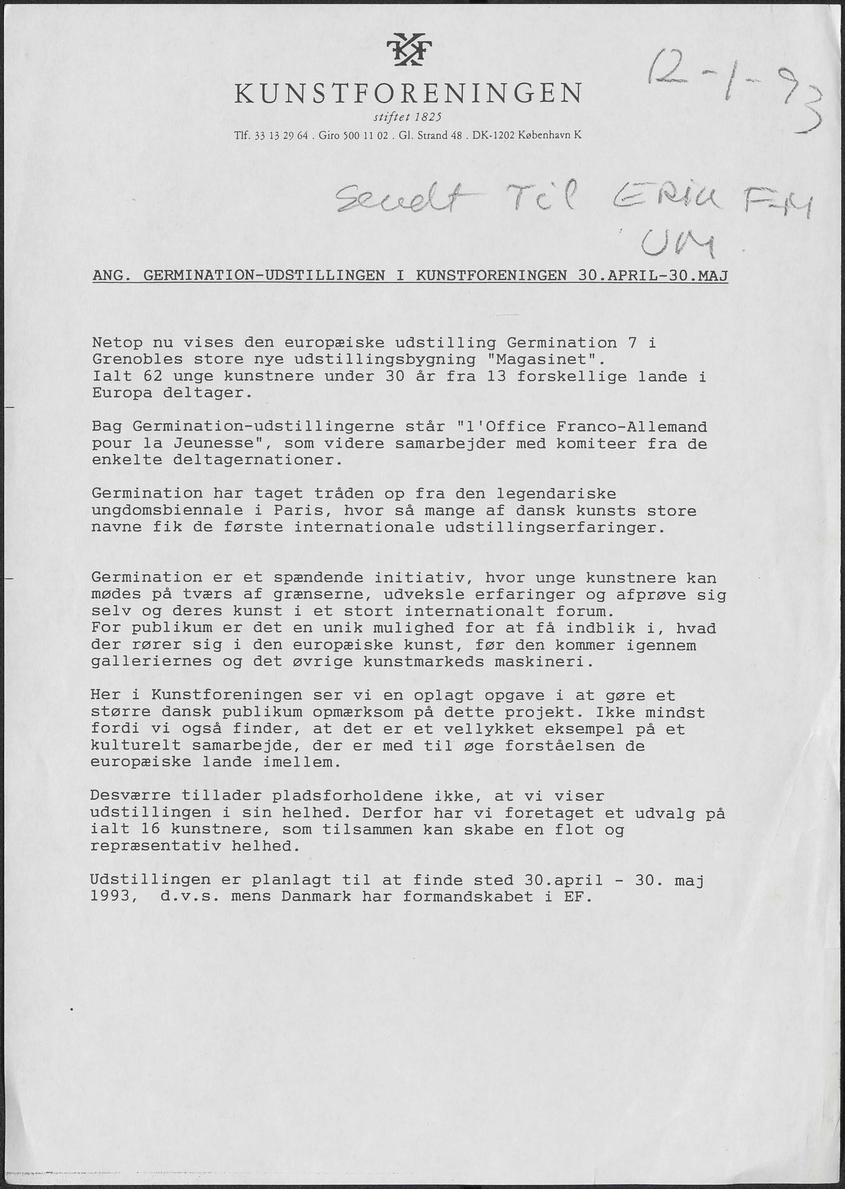 Back Kunstforeningen Udstillingsinformation, 1993: Germinations 7 Facts Document type Exhibition records Mentioned exhibitions 1993-4-30 - 1993-5-30, Germinations 7 - europæisk biennale for unge kunstnere Original