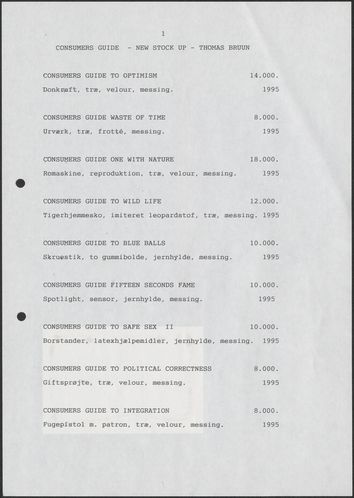 Back Kunstforeningen Værkliste, 1995: Thomas Bruun. Consumers Guides - New Stock Up Facts Document type Exhibition records Mentioned people Thomas Bruun Mentioned exhibitions 1995-1-28 - 1995-3-12, Thomas Bruun. Consumers Guides - New Stock Up Original