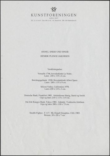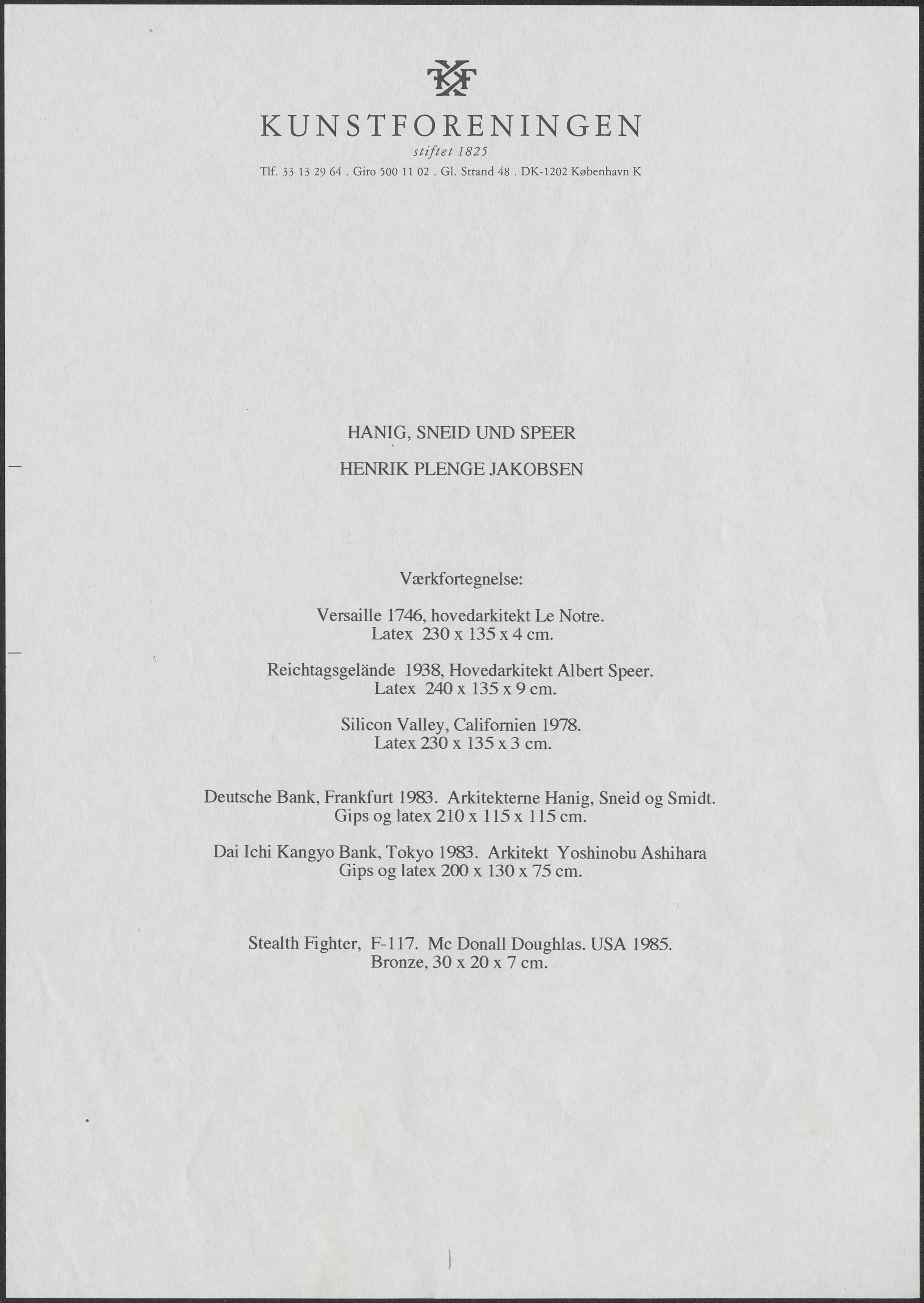 Back Kunstforeningen Værkliste, 1992: Henrik Plenge Jakobsen. HANIG, SNEID UND SPEER Facts Document type Exhibition records Mentioned people Henrik Plenge Jakobsen Mentioned exhibitions 1992-9-26 - 1992-10-18, Henrik Plenge Jakobsen. HANIG, SNEID UND SPEER Original