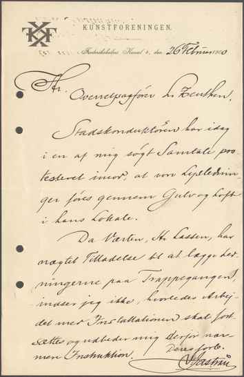 Back Kunstforeningen 1900-02-26 Sender Viggo Jastrau Recipient Kunstforeningens bestyrelse, L. Zeuthen Document content Awaiting summary Facts Document type Letter Language Dansk Sender's location Frederiksholms Kanal 4 Mentioned people A.F. Lassen Original
