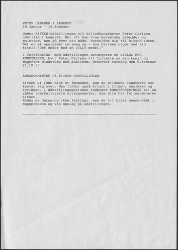 Back Kunstforeningen Udstillingsinformation, 1992: Peter Carlsen Facts Document type Exhibition records Mentioned people Peter Carlsen Mentioned exhibitions 1992-1-18 - 1992-3-1, Kitsch bli'r kunst 1992-1-18 - 1992-2-16, Peter Carlsen. Det ender med en VILLY model Original