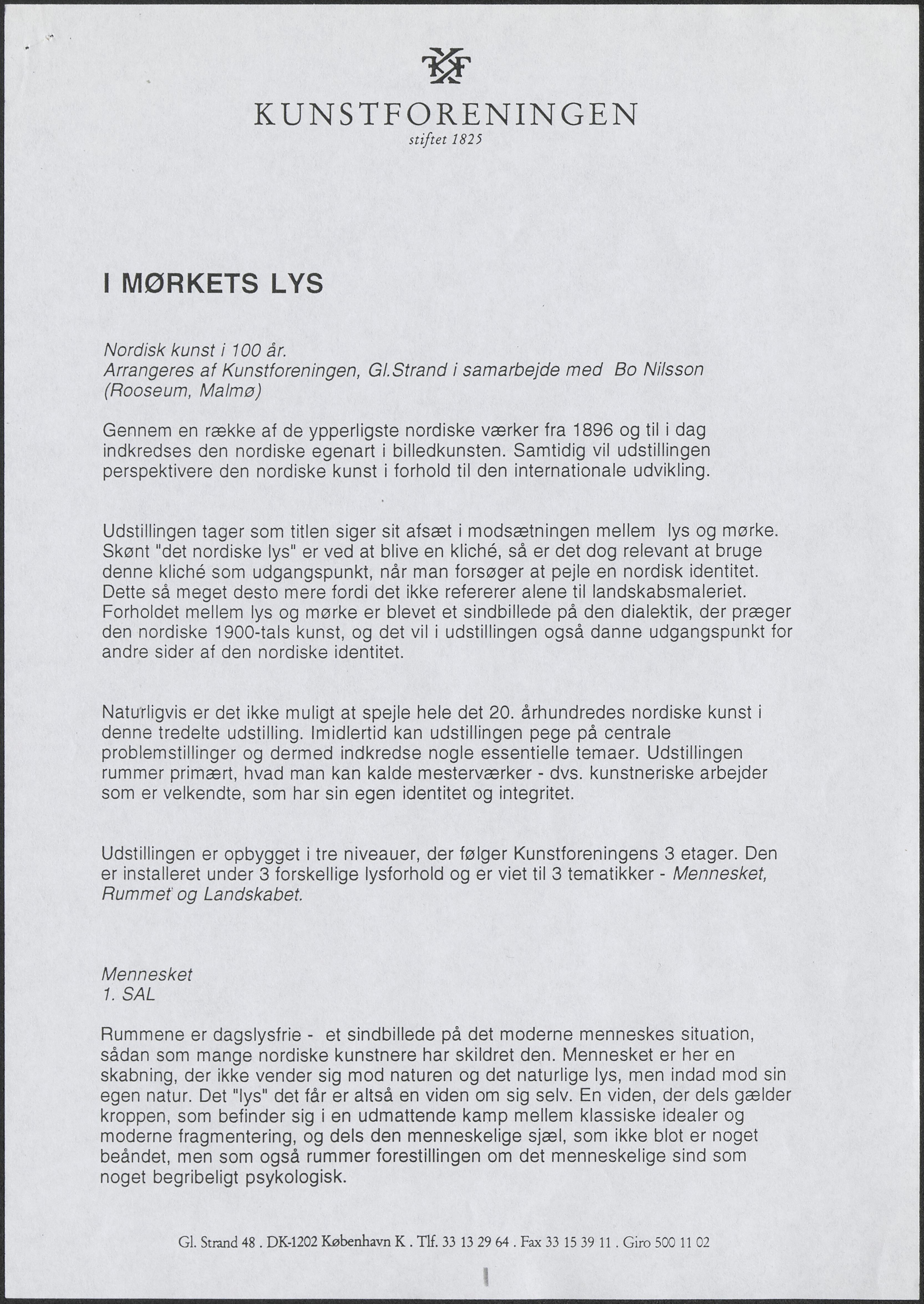 Back Kunstforeningen Udstillingsinformation, 1996: Mørkets lys Facts Document type Exhibition records Mentioned exhibitions 1996-1-13 - 1996-3-17, Mørkets lys. Nordisk kunst gennem 100 år Original