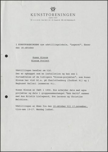 Back Kunstforeningen Pressemeddelelse, 1991: Hinnum Project Facts Document type Exhibition records Mentioned people Susan Hinnum Mentioned exhibitions 1991-10-19 - 1991-11-17, Hinnum Project Original