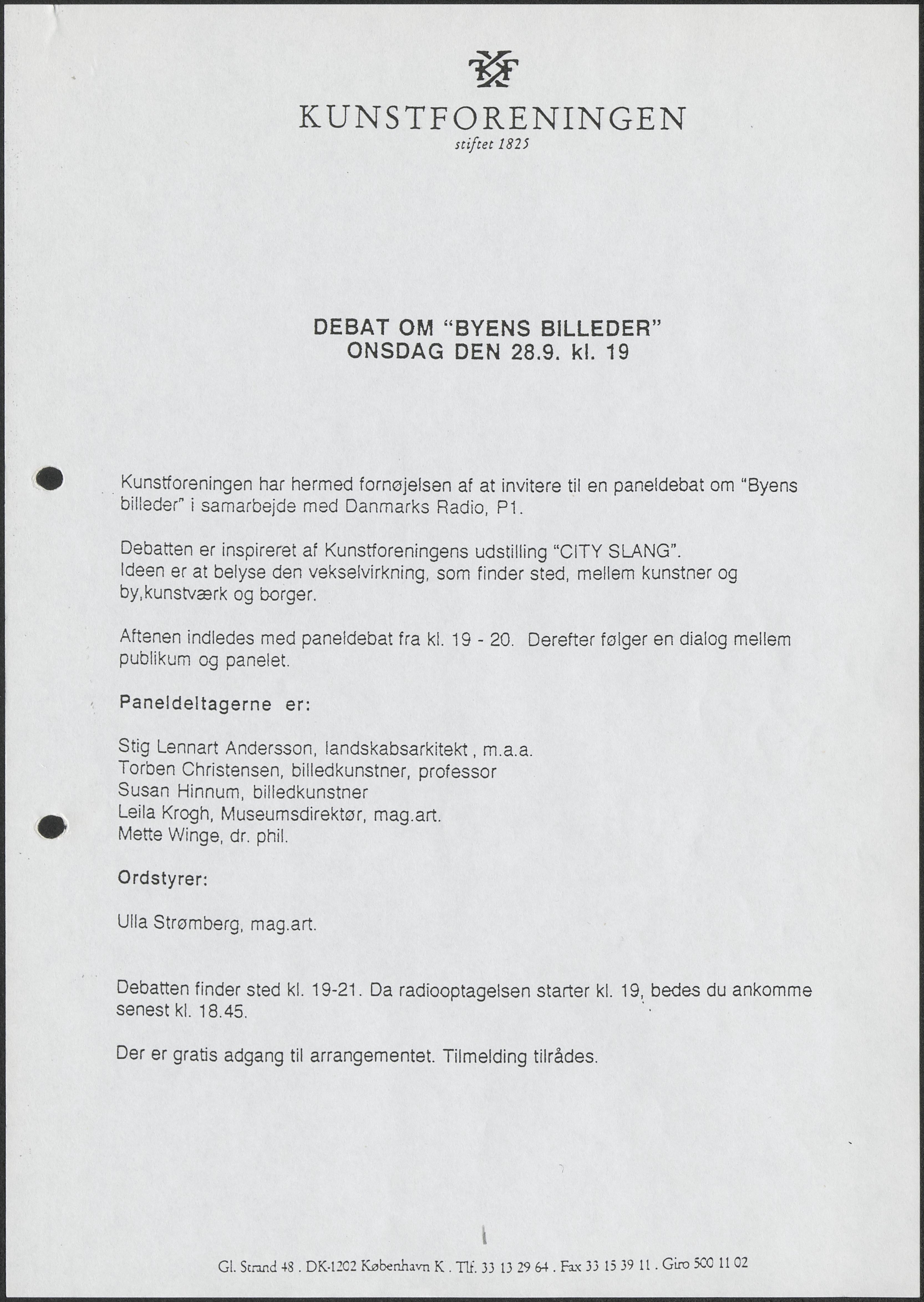 Back Kunstforeningen Arrangementsprogram, 1994: CITY SLANG Facts Document type Exhibition records Mentioned exhibitions 1994-8-27 - 1994-10-23, CITY SLANG Original