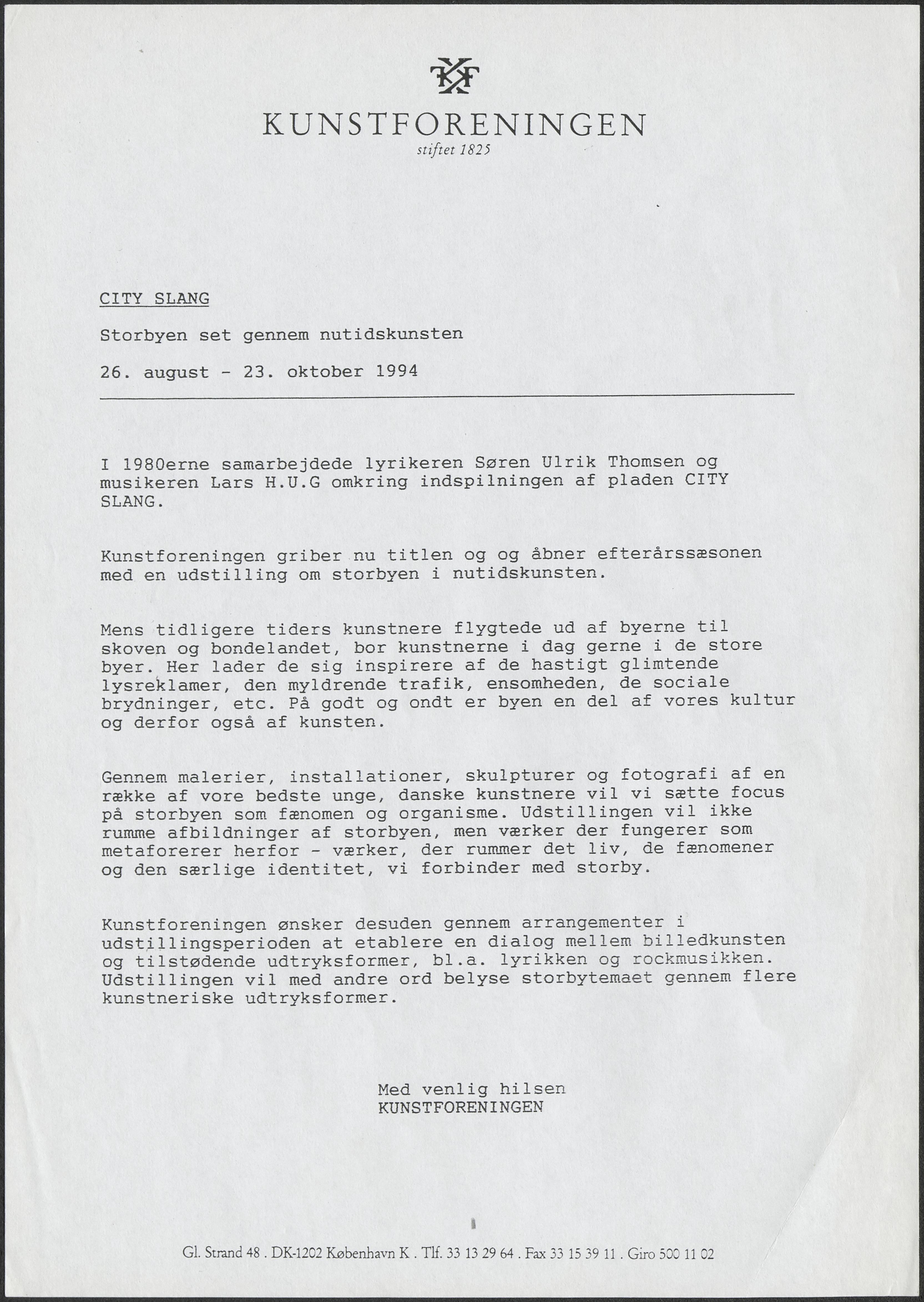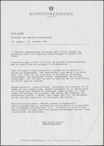 Back Kunstforeningen Formidlingsmateriale, 1994: CITY SLANG Facts Document type Exhibition records Mentioned exhibitions 1994-8-27 - 1994-10-23, CITY SLANG Original