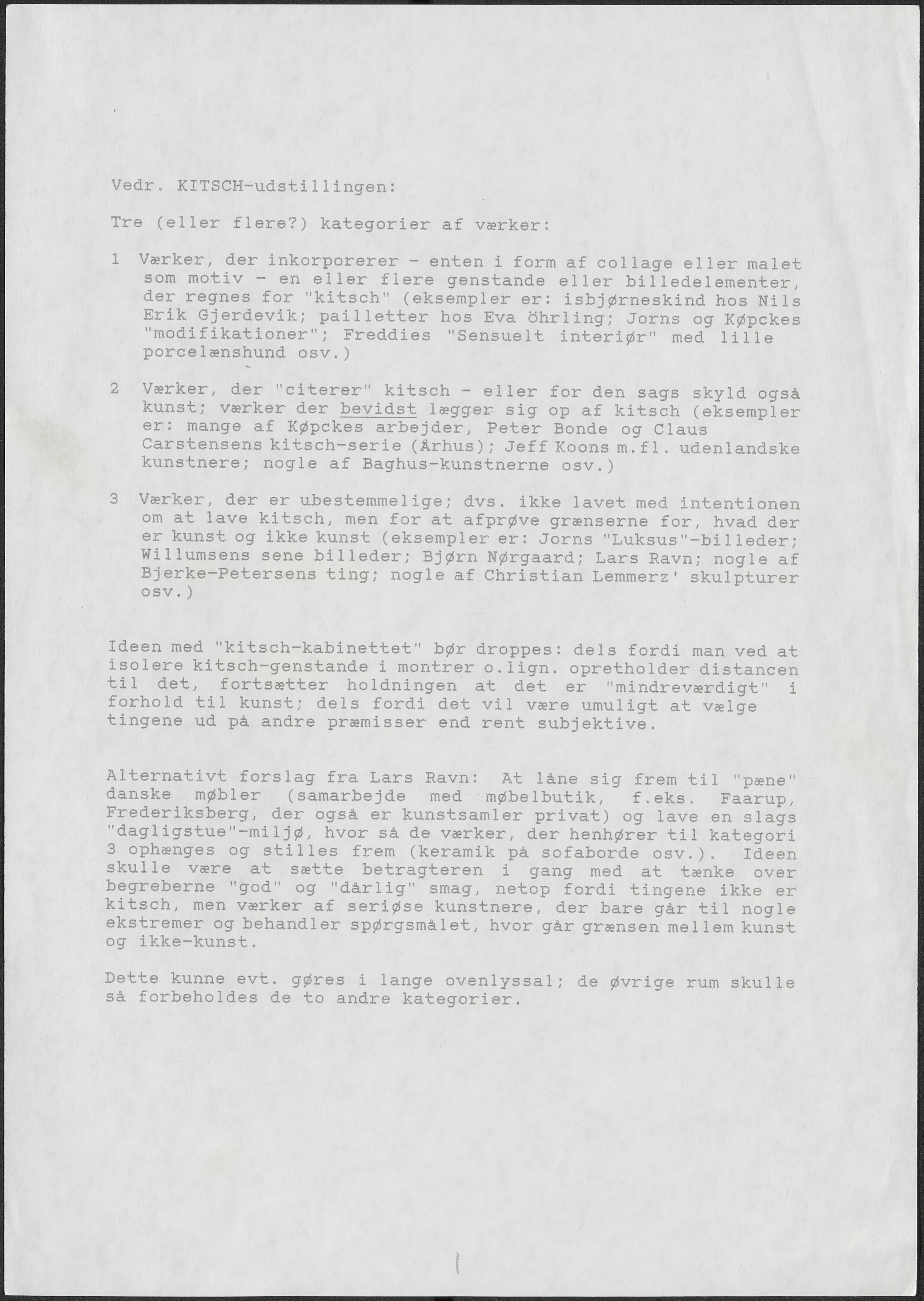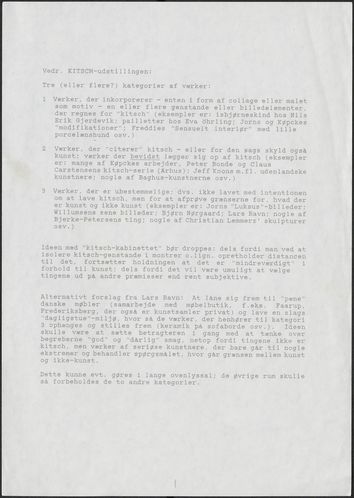 Back Kunstforeningen Diverse noter, 1992: Kitsch bli'r kunst Facts Document type Exhibition records Mentioned exhibitions 1992-1-18 - 1992-3-1, Kitsch bli'r kunst Original
