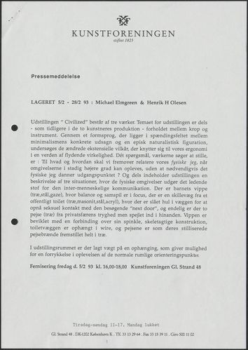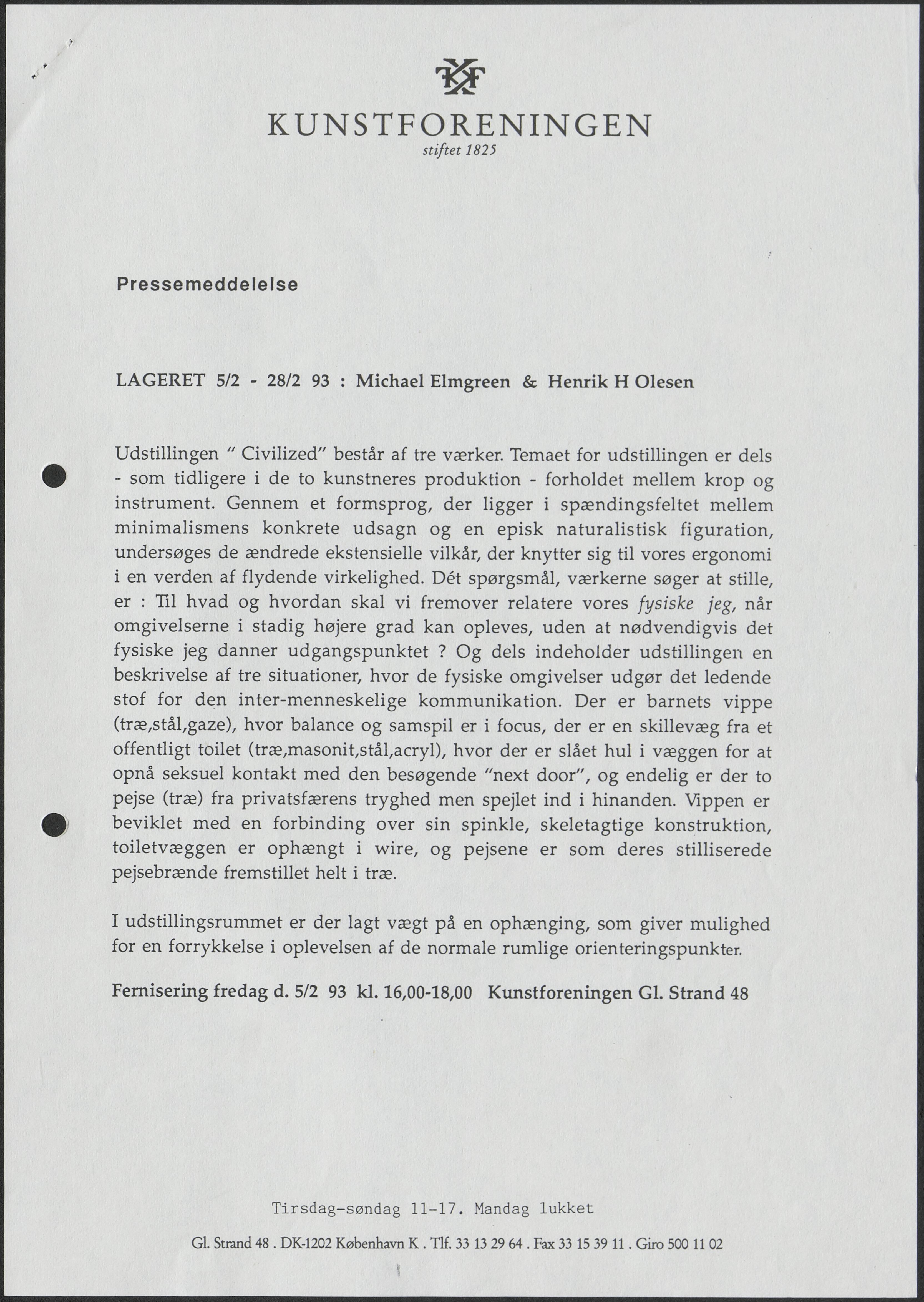 Back Kunstforeningen Pressemeddelelse, 1993: Michael Elmgreen og Henrik H. Olesen. Civilized Facts Document type Exhibition records Mentioned people Michael ElmgreenHenrik Olesen Mentioned exhibitions 1993-2-5 - 1993-2-28, Michael Elmgreen og Henrik H. Olesen. Civilized Original
