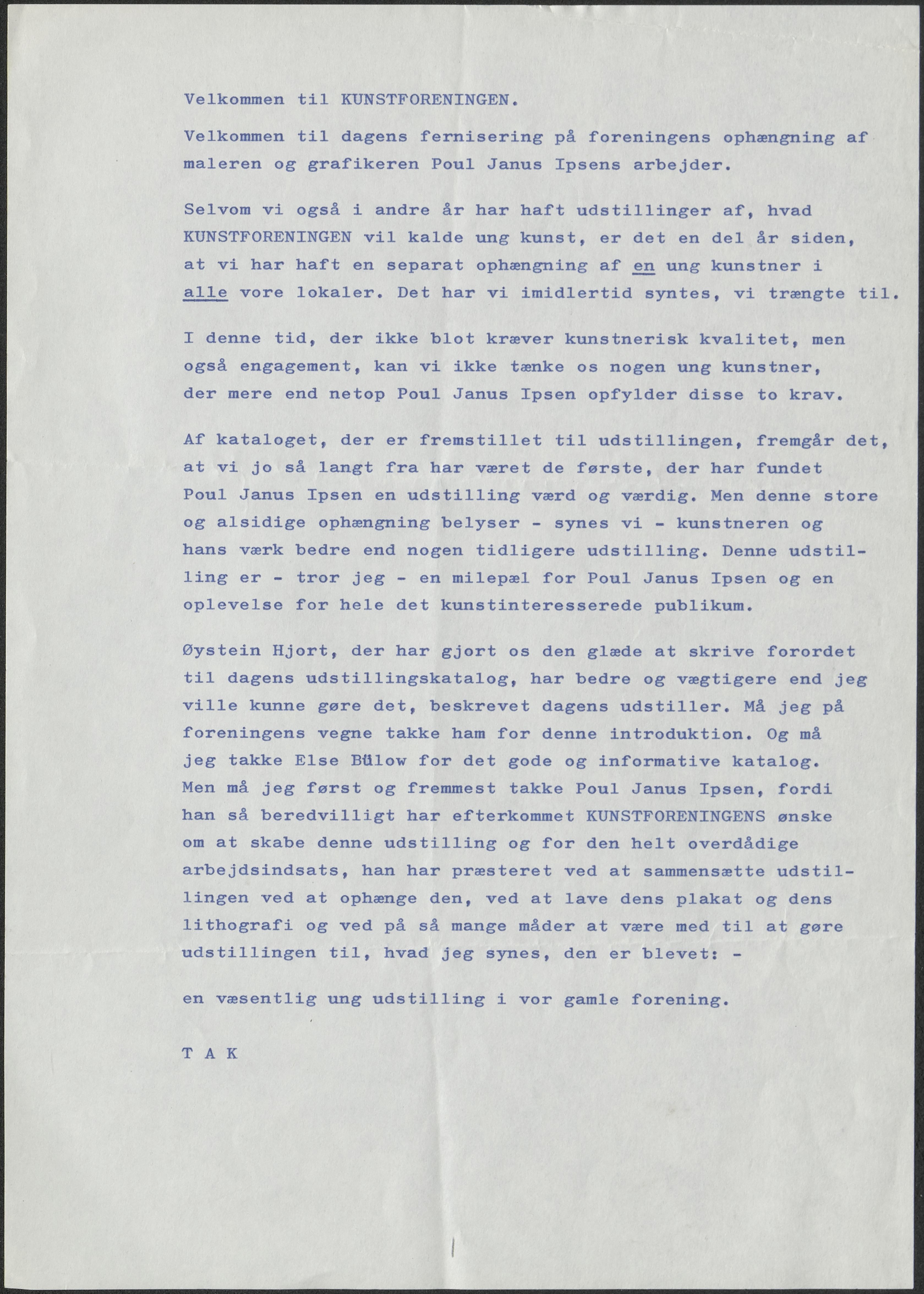 Back Kunstforeningen 1974 Document content Awaiting summary Facts Document type Speech Mentioned people Poul Janus Ipsen Mentioned exhibitions 1974-10-11 - 1974-11-10, Poul Janus Ipsen Original