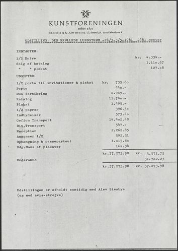Back Kunstforeningen Udstillingsregnskab, 1981: Den krøllede Lundstrøm Facts Document type Exhibition records Mentioned people Vilhelm Lundstrøm Mentioned exhibitions 1981-3-25 - 1981-5-3, Den krøllede Lundstrøm Original