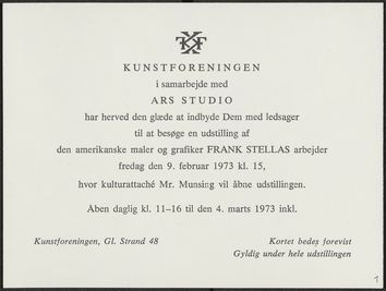 Back Kunstforeningen 1973-02-09 Facts Document type Invitation card Sender's location København Mentioned people Ars StudioFrank Stella Mentioned exhibitions 1973-2-9 - 1973-3-4, Frank Stellas grafiske arbejder Original
