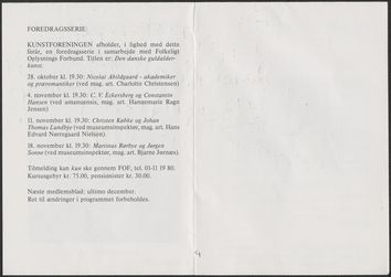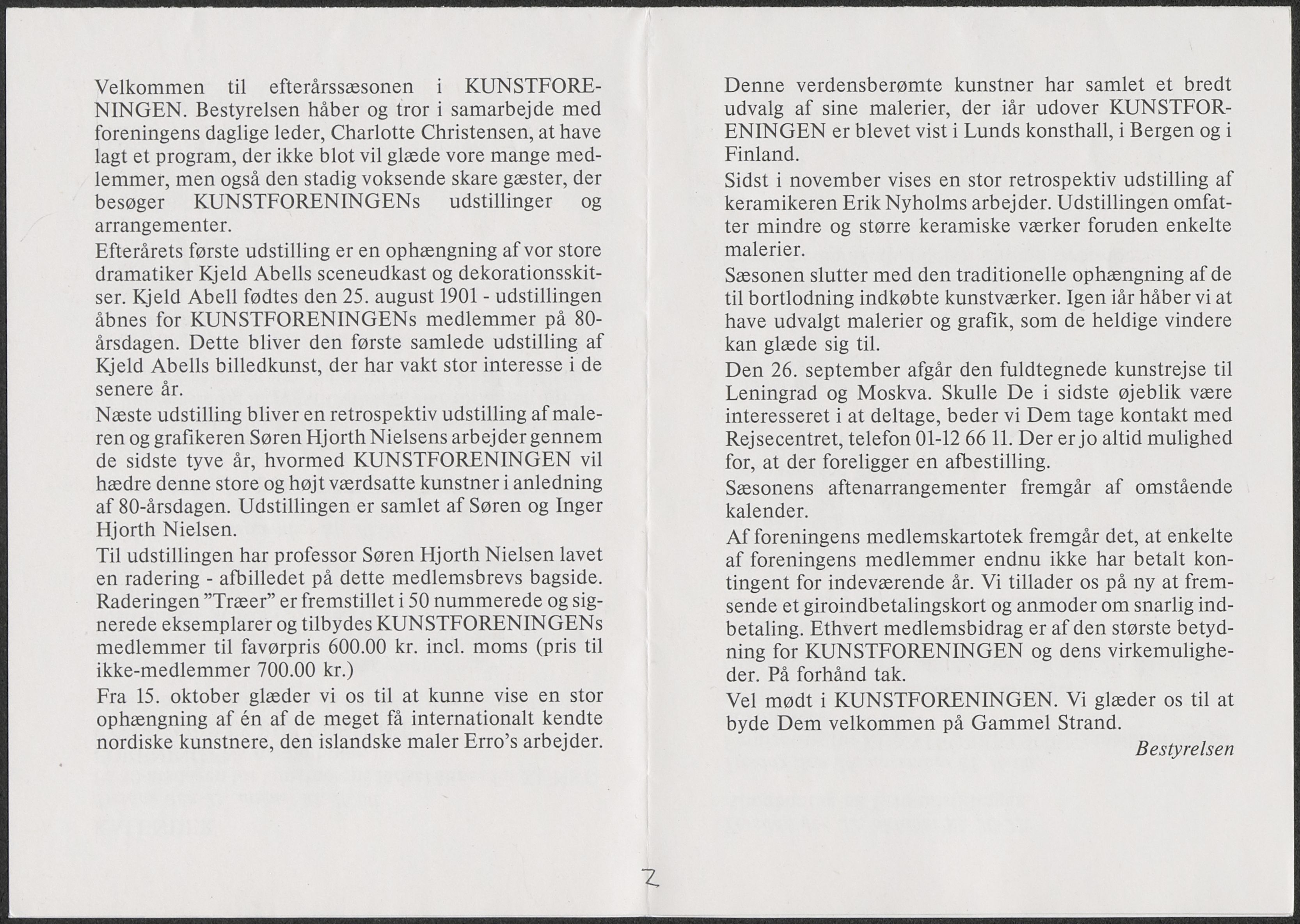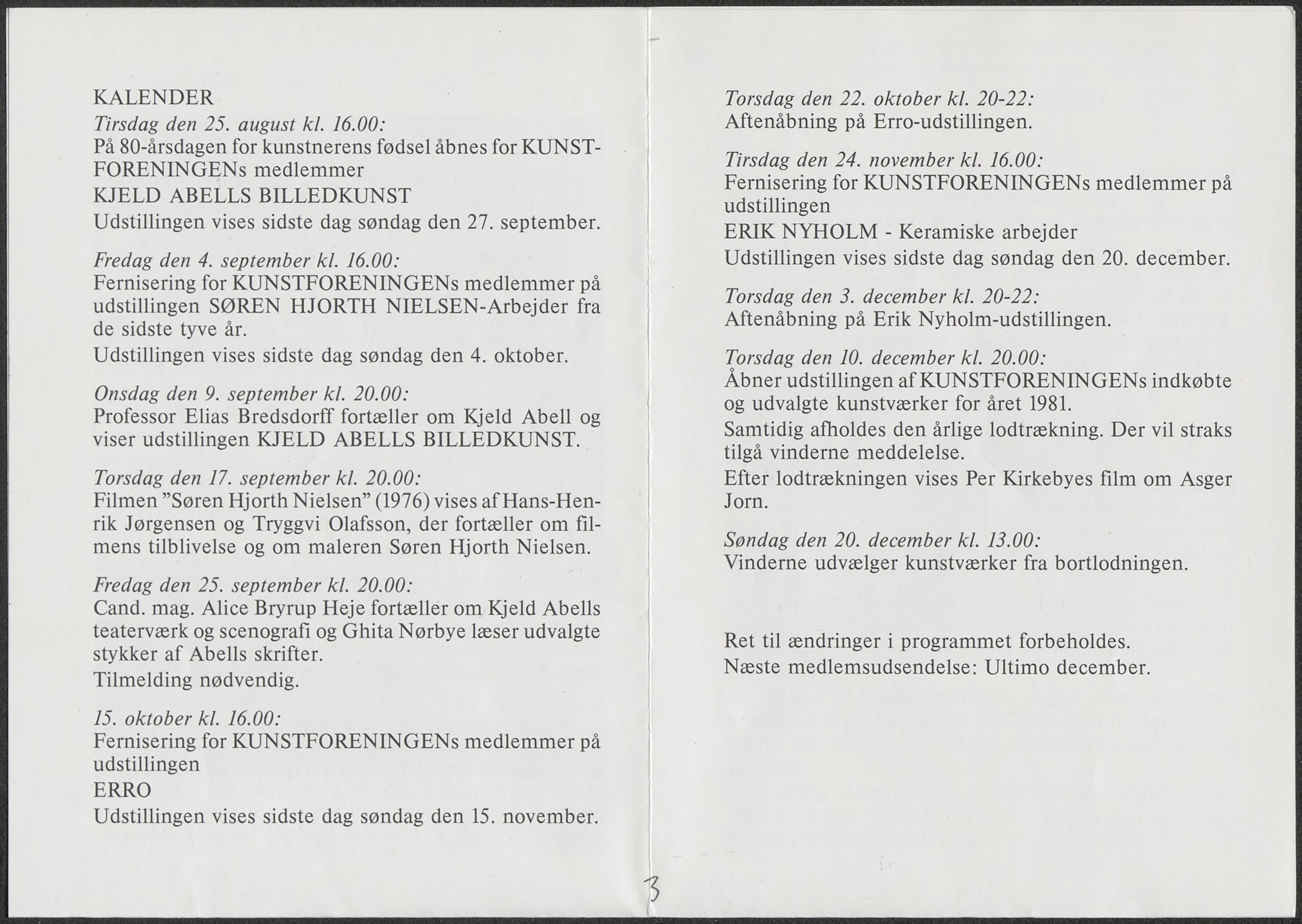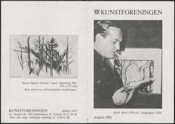 Back Kunstforeningen 1981 Facts Document type Brochure Mentioned people Kjeld AbellSøren Hjorth NielsenErik Nyholm Mentioned exhibitions 1981-7-25 - 1981-9-27, Kjeld Abells billedkunst 1981-9-5 - 1981-10-4, Søren Hjorth Nielsen 1981-11-24 - 1981-12-20, Erik Nyholm Original
