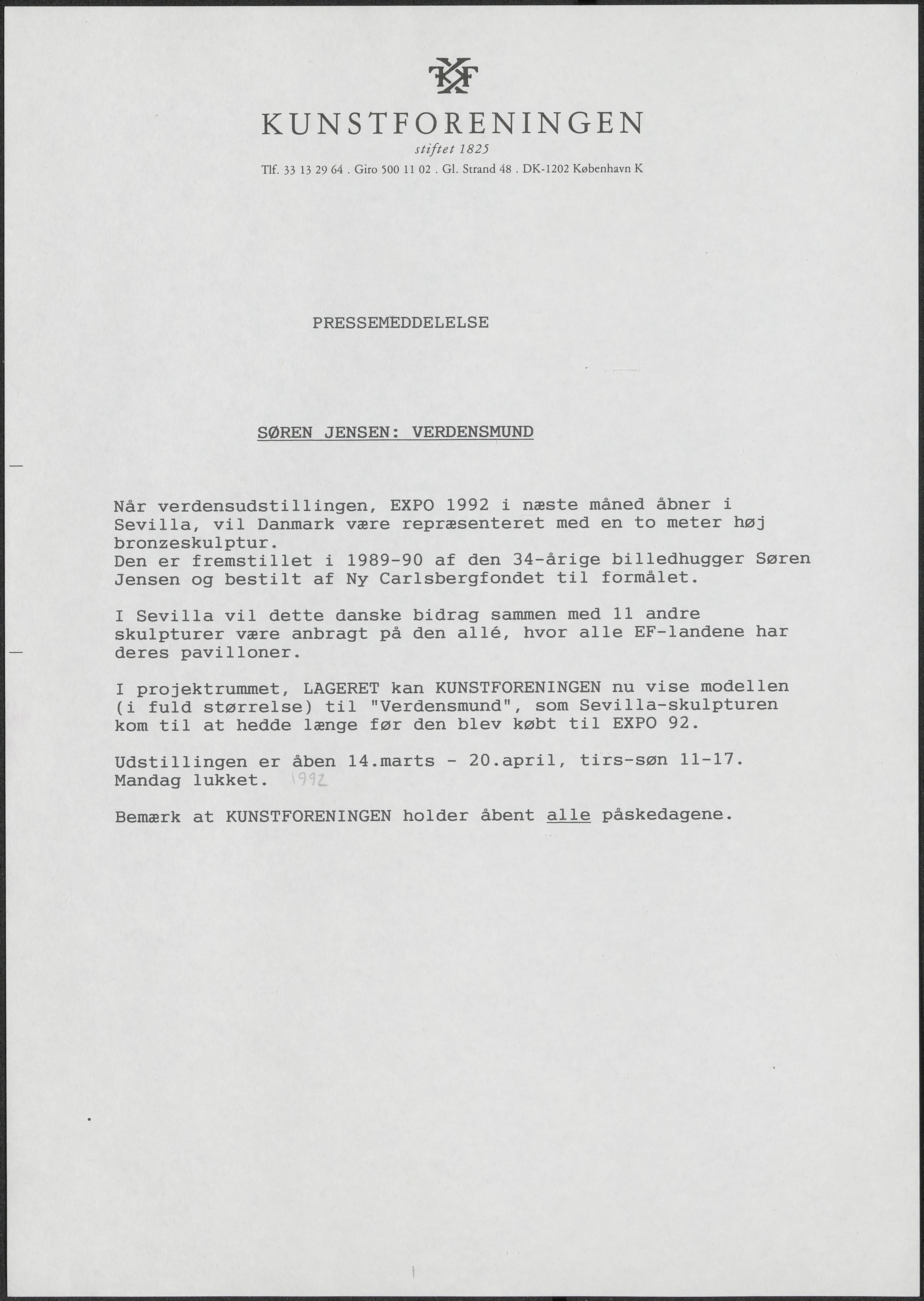 Back Kunstforeningen Pressemeddelelse, 1992: Søren Jensen: Verdensmund Facts Document type Exhibition records Mentioned people Søren Jensen Mentioned exhibitions 1992-3-14 - 1992-4-20, Søren Jensen: Verdensmund Original