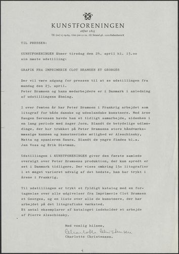 Back Kunstforeningen Pressemeddelelse, 1979: Grafik fra Imprimerie Clot, Bramsen et Georges Facts Document type Exhibition records Mentioned people Peter Bramsen Mentioned exhibitions 1979-4-24 - 1979-7-1, Grafik fra Imprimerie Clot, Bramsen et George Original