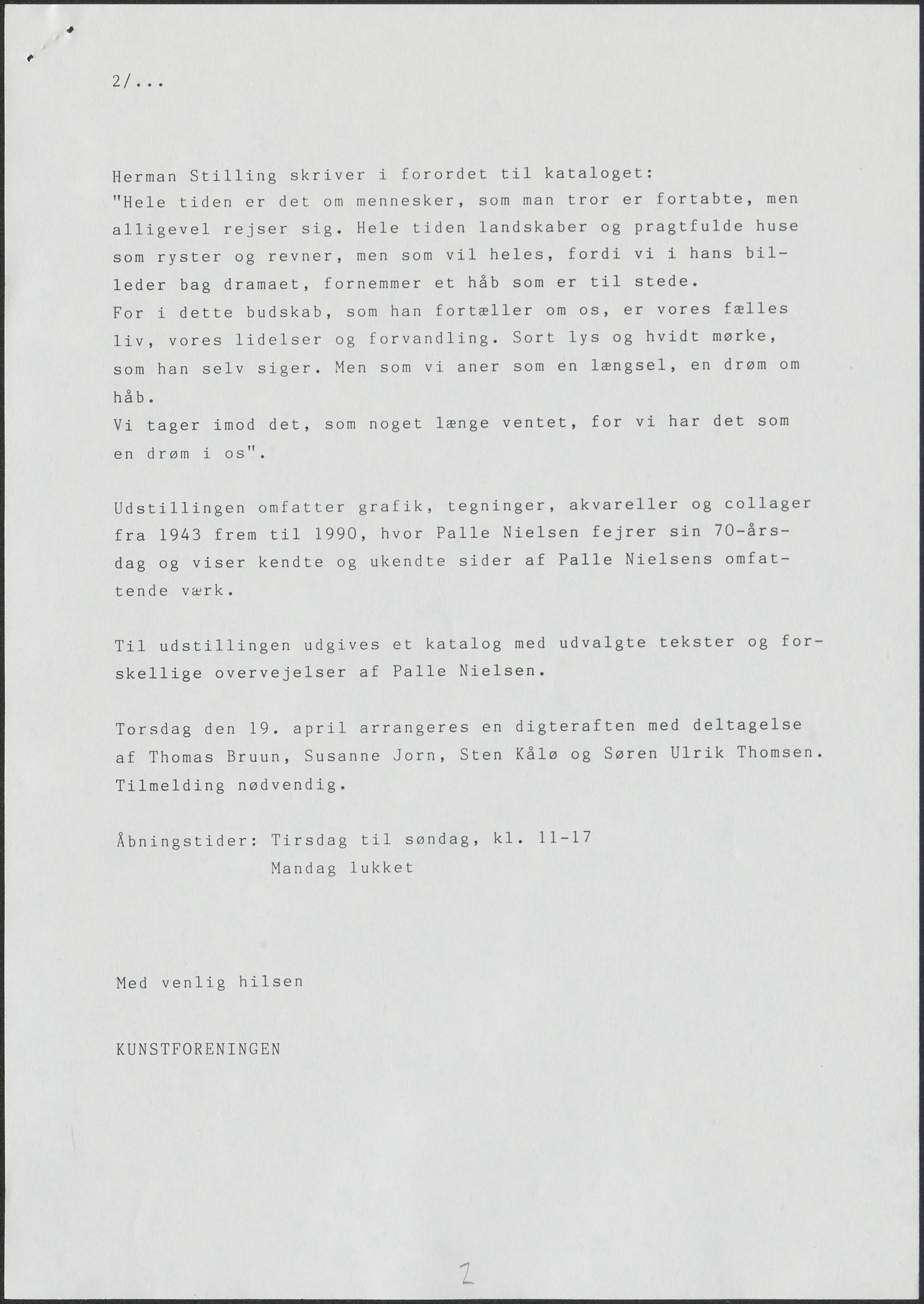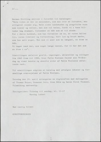 Back Kunstforeningen Pressemeddelelse, 1990: Palle Nielsen. Sort lys og hvidt mørke Facts Document type Exhibition records Mentioned people Palle Nielsen Mentioned exhibitions 1990-3-24 - 1990-4-22, Palle Nielsen. Sort lys og hvidt mørke Original