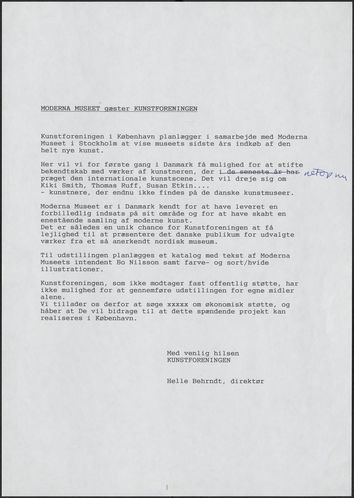 Back Kunstforeningen 1993 Sender Helle Behrndt, Kunstforeningen Recipient Document content Awaiting summary Facts Document type Letter Sender's location København Mentioned exhibitions 1993-3-13 - 1993-4-18, UDSYN - med Moderna Museet ind i 90'erne Original