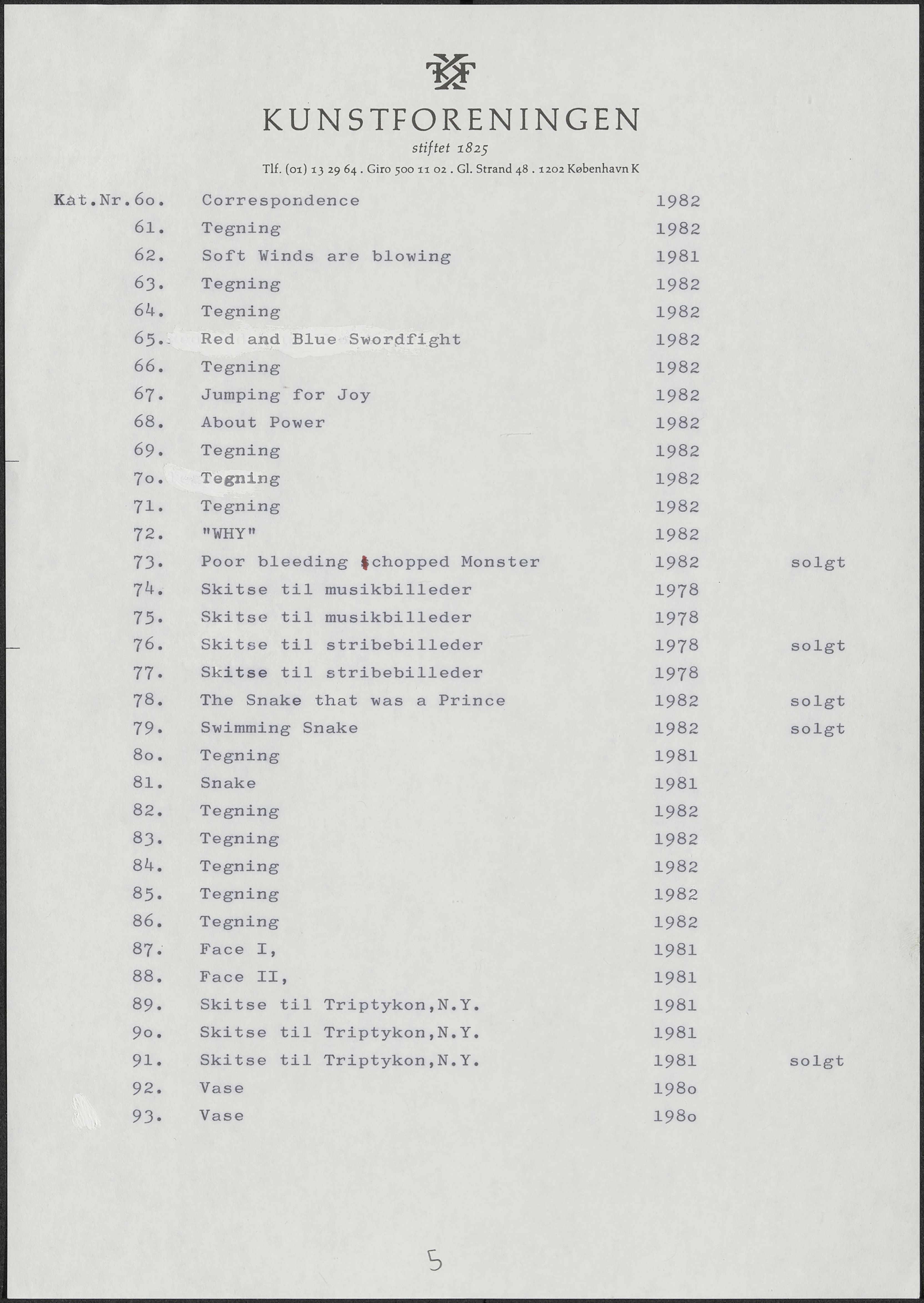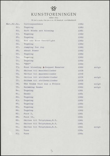 Back Kunstforeningen Salgsliste, 1982: Eva Weis Bentzon Facts Document type Exhibition records Mentioned people Eva Weis Bentzon Mentioned exhibitions 1982-9-3 - 1982-9-26, Eva Weis Bentzon. Malerier og tegninger Original