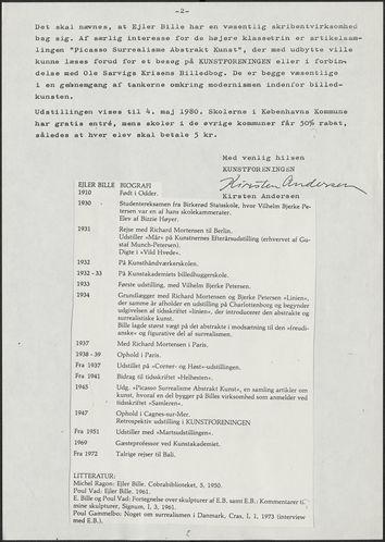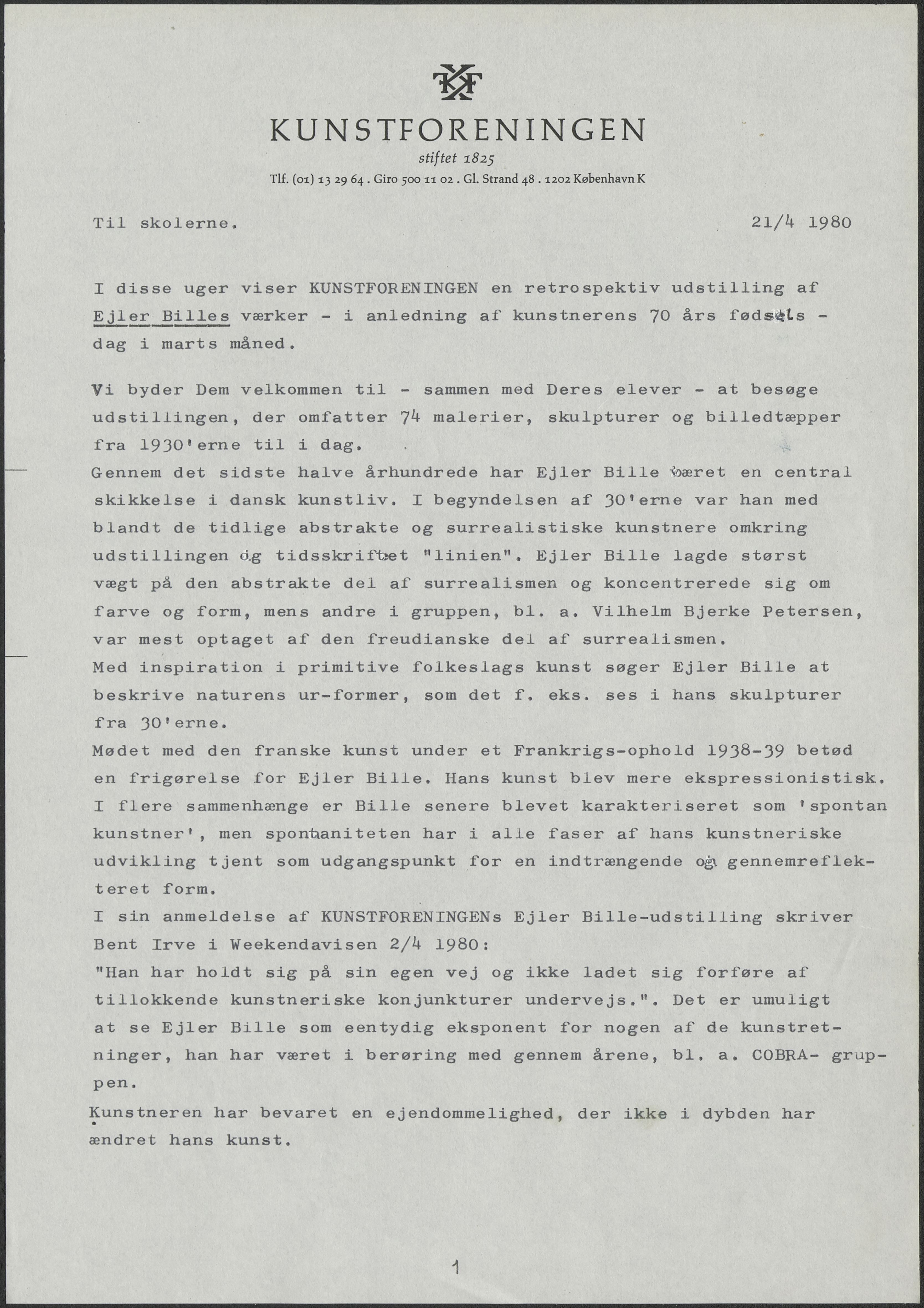 Back Kunstforeningen Formidlingsmateriale, 1980: Ejler Bille Facts Document type Exhibition records Mentioned people Ejler Bille Mentioned exhibitions 1980-3-18 - 1980-5-4, Ejler Bille Original