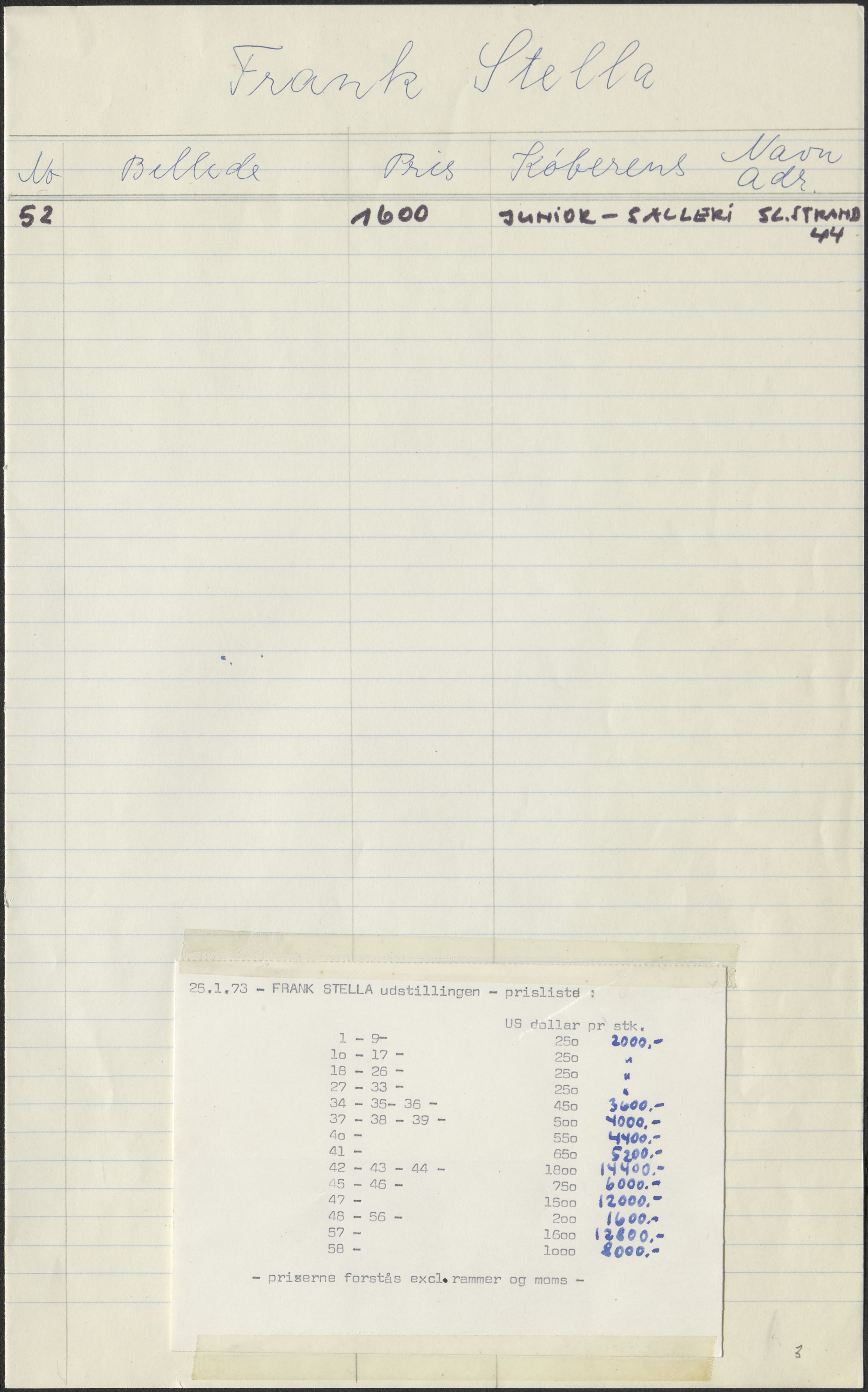 Back Kunstforeningen Prisliste, 1973: Frank Stella Facts Document type Exhibition records Mentioned people Frank Stella Mentioned exhibitions 1973-2-9 - 1973-3-4, Frank Stellas grafiske arbejder Original