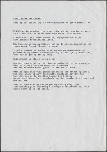 Back Kunstforeningen Udstillingsforslag, 1992: Kitsch bli'r kunst Facts Document type Exhibition records Mentioned exhibitions 1992-1-18 - 1992-3-1, Kitsch bli'r kunst Original