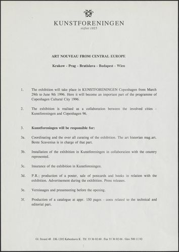 Back Kunstforeningen Udstillingsaftale, 1996: Art Nouveau i Central Europa Facts Document type Exhibition records Mentioned exhibitions 1996-3-30 - 1996-6-9, Art Nouveau i Central Europa Original