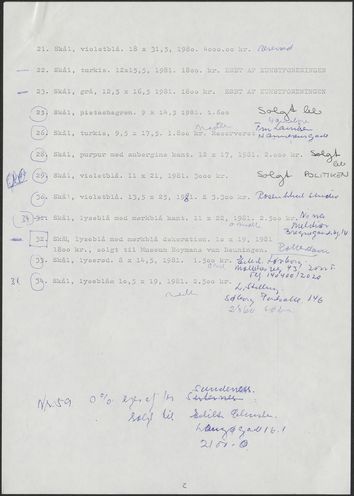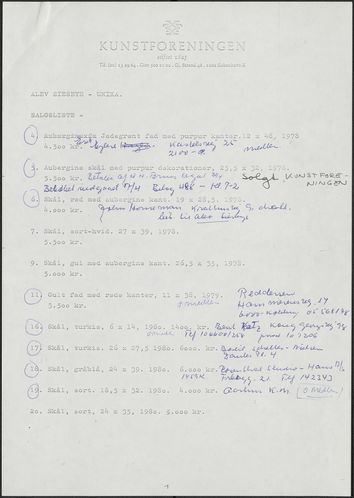 Back Kunstforeningen Salgsliste, 1981: Alev Siesbye Facts Document type Exhibition records Mentioned people Alev Siesbye Mentioned exhibitions 1981-3-19 - 1981-5-3, Alev Siesbye - unika fra værkstedet Original