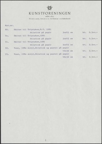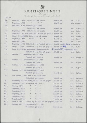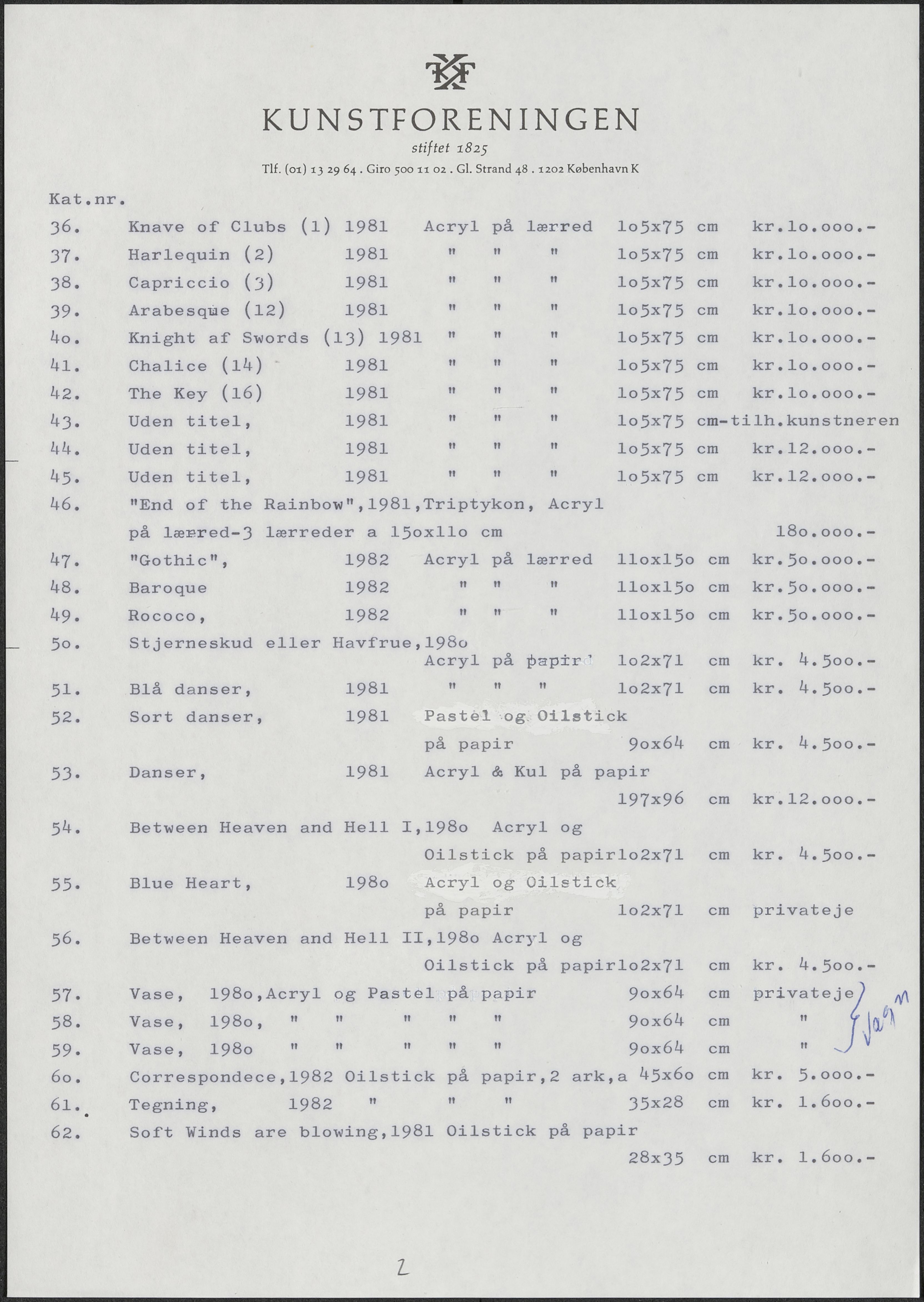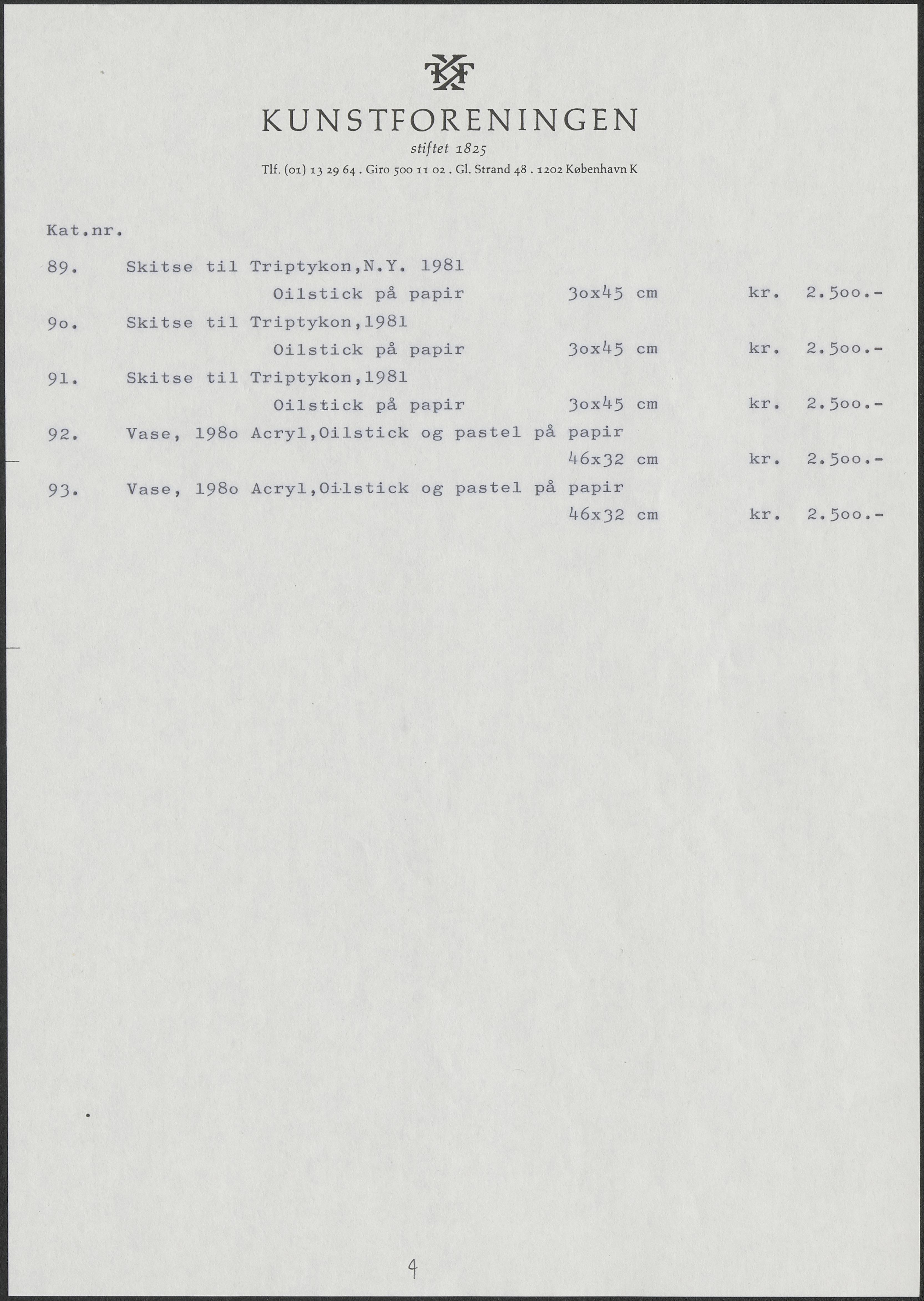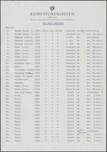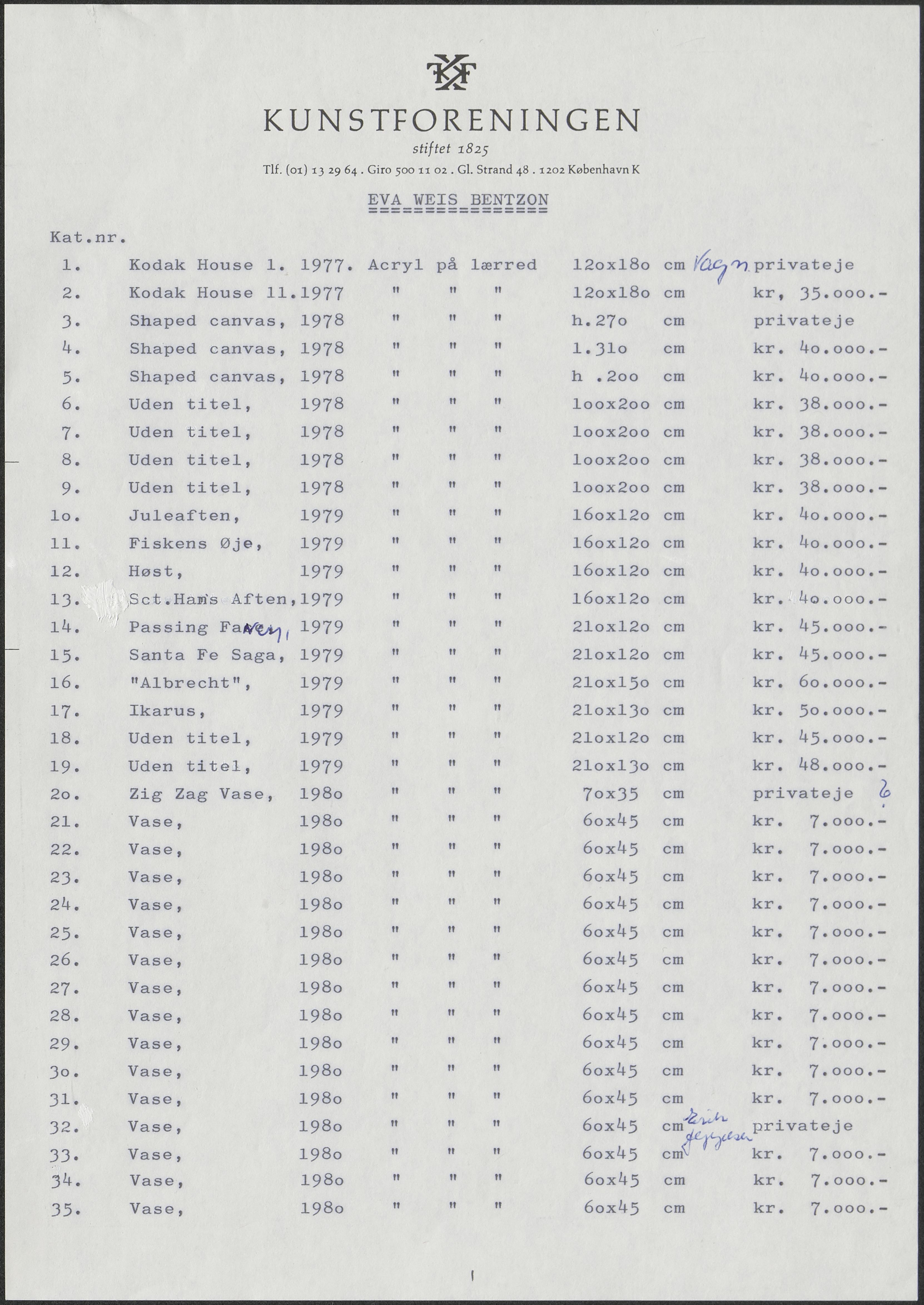Back Kunstforeningen Værkliste, 1982: Eva Weis Bentzon Facts Document type Exhibition records Mentioned people Eva Weis Bentzon Mentioned exhibitions 1982-9-3 - 1982-9-26, Eva Weis Bentzon. Malerier og tegninger Original