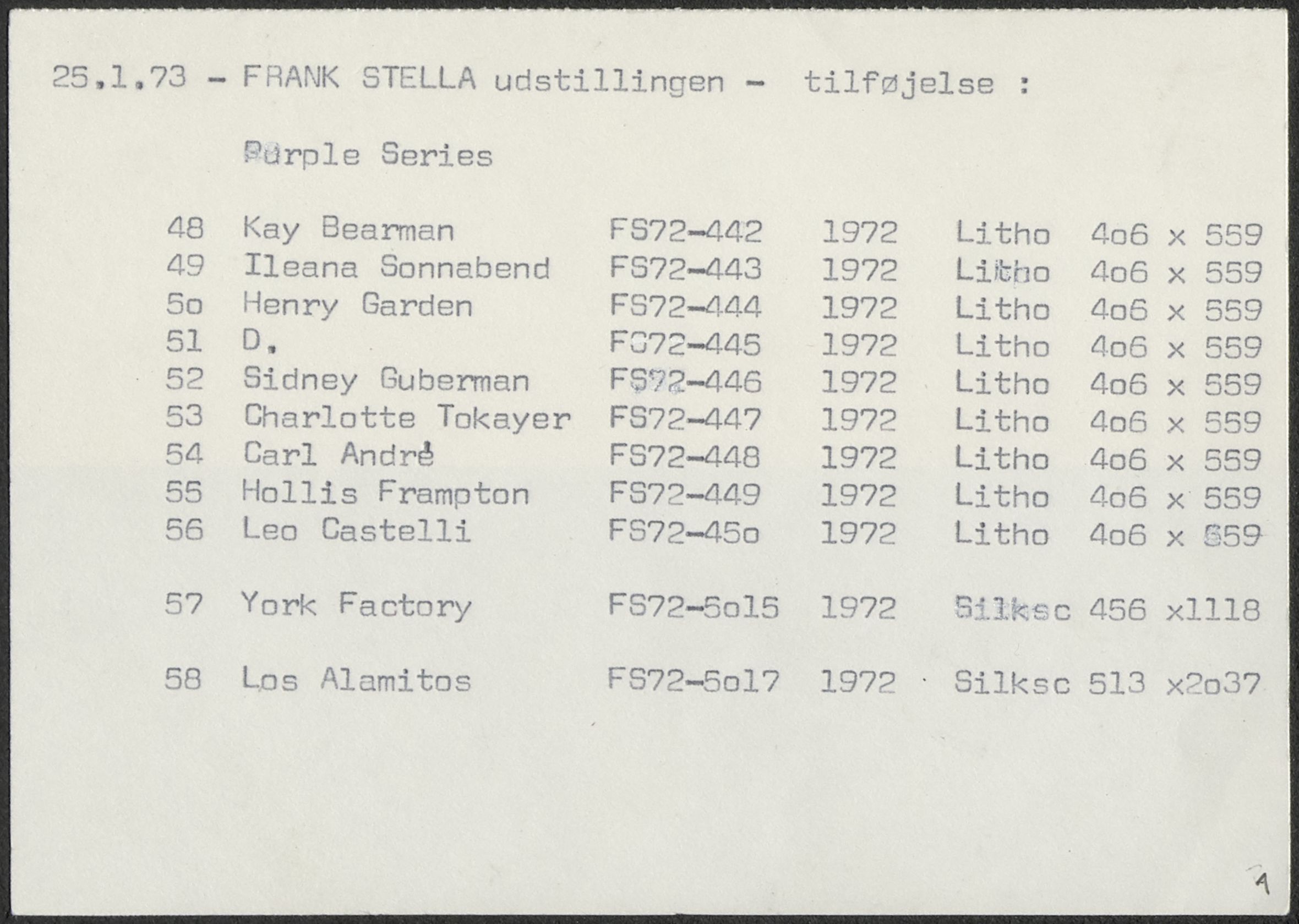 Back Kunstforeningen Diverse noter, 1973: Frank Stella Facts Document type Exhibition records Mentioned people Frank Stella Mentioned exhibitions 1973-2-9 - 1973-3-4, Frank Stellas grafiske arbejder Original