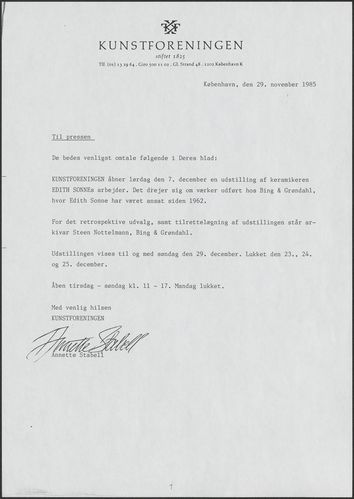 Back Kunstforeningen Pressemeddelelse, 1985: Edith Sonne Facts Document type Exhibition records Mentioned people Edith Sonne Bruun Mentioned exhibitions 1985-12-7 - 1985-12-29, Edith Sonne. Keramiske arbejder udført hos Bing & Grøndahl Original